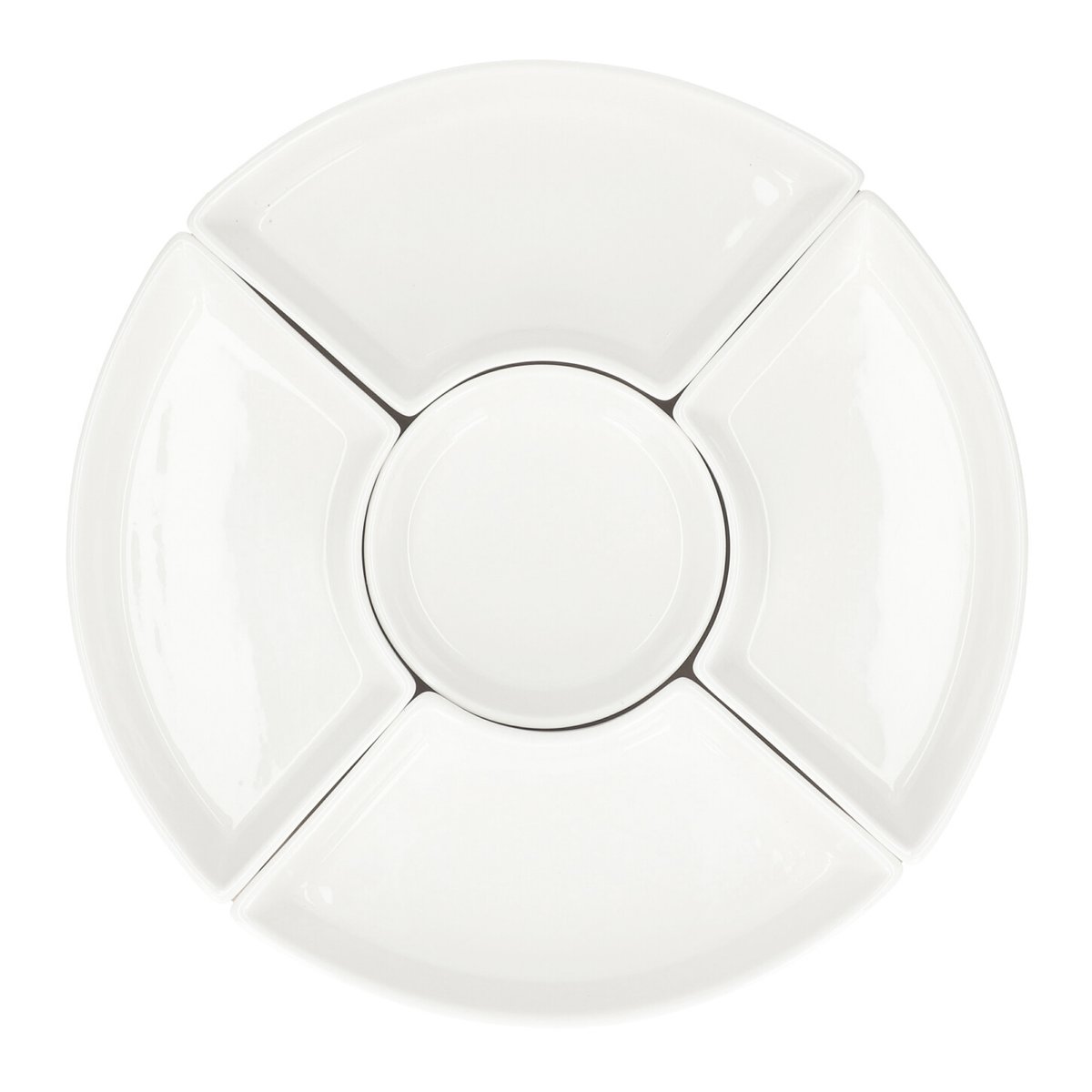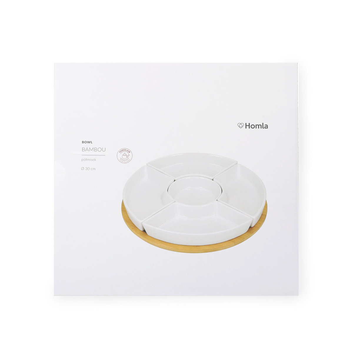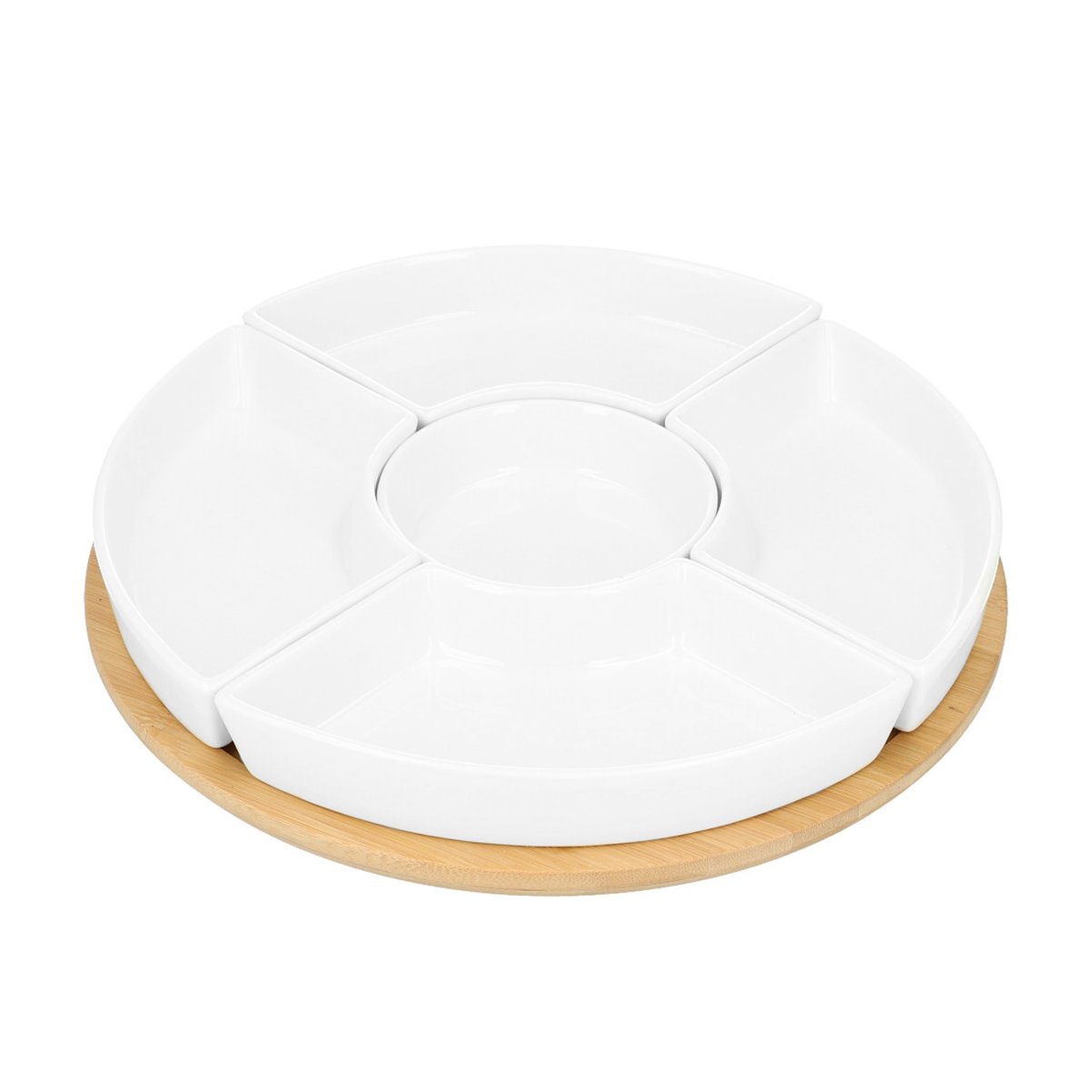 Półmisek FINCAN składa się z pięciu części układających się w koło - każda z nich stanowi osobną miseczkę na przekąski lub sos. Podstawa wykonana z bambusa jest obrotowa, dzięki czemu łatwiej dzielić się przekąskami przy stole. Półmisek utrzymany jest w kolorze klasycznej bieli i naturalnego drewna, dlatego pięknie komponować się będzie z eleganckimi zastawami i tradycyjnym wystrojem stołu. Średnica produktu to 30cm.