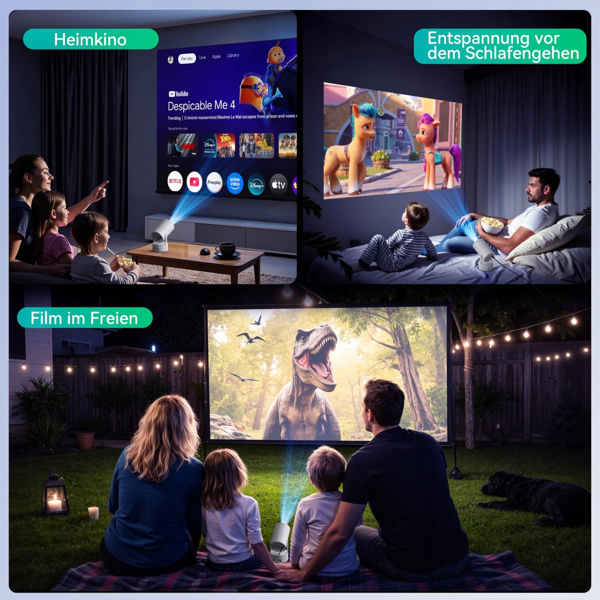 - [Mini Beamer z akumulatorem] Brak gniazdek? Żaden problem! Ciesz się pełnym filmem przez 2,5 godziny lub 6 godzin muzyki z Polocsh mini projektorem z akumulatorem na jednym ładowaniu. Lub użyj kabla zasilającego do zasilania w domu. Z mini projektorem Polocsh możesz mieć kino domowe wszędzie, w środku lub na zewnątrz.