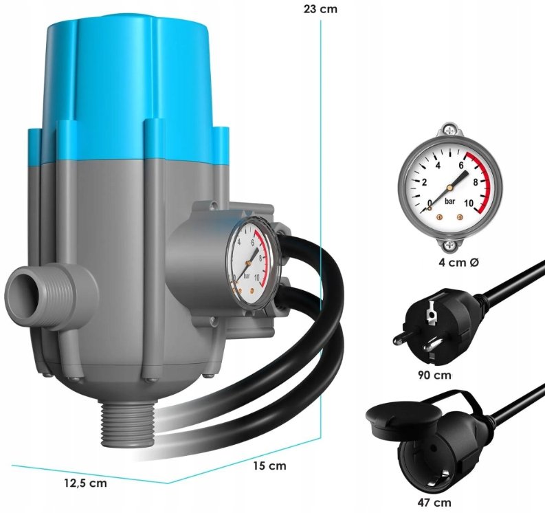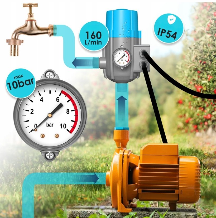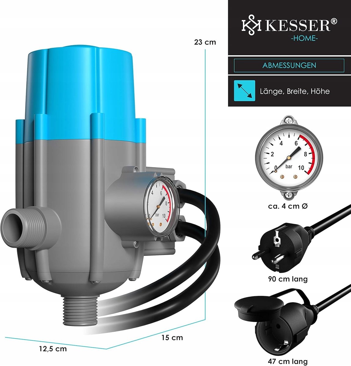 Ten przełącznik ciśnienia firmy KESSER zapewnia stałe ciśnienie wody do nawadniania ogrodu lub zaopatrzenia w wodę gospodarstwa domowego. Dzięki sterowaniu pompą pompa wodna jest automatycznie włączana i wyłączana w zależności od otwarcia i zamknięcia odbiornika. Gwarantuje to stałe ciśnienie w domowych wodociągach; w przypadku braku wody zadziała zabezpieczenie przed suchobiegiem i pompa się zatrzyma. Sterowanie pompą eliminuje wpływ skoków ciśnienia.