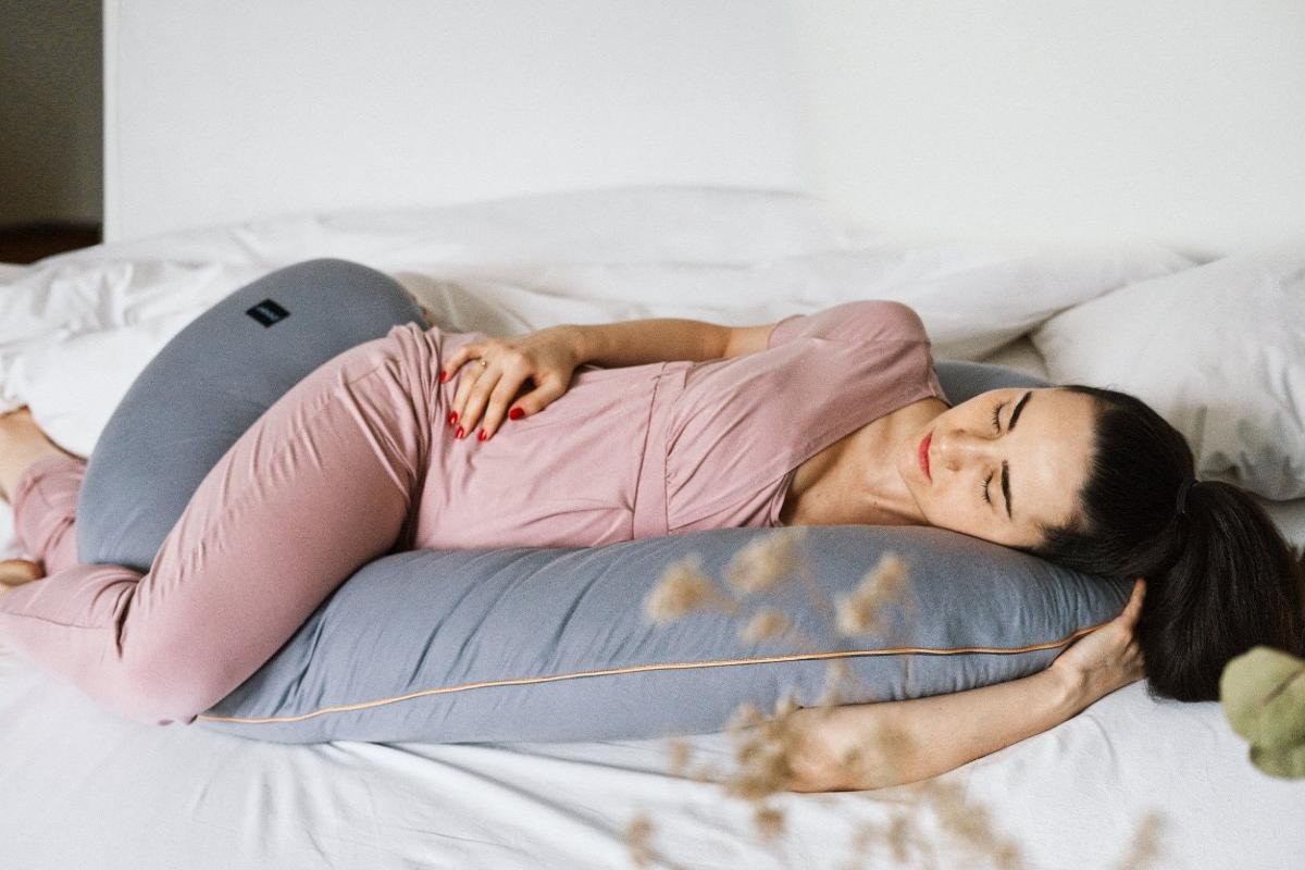 Dzięki formie cyfry 9 poduszka stanowi podparcie na całej linii ciała – od głowy i łopatek, przez brzuch aż do bioder i nóg.