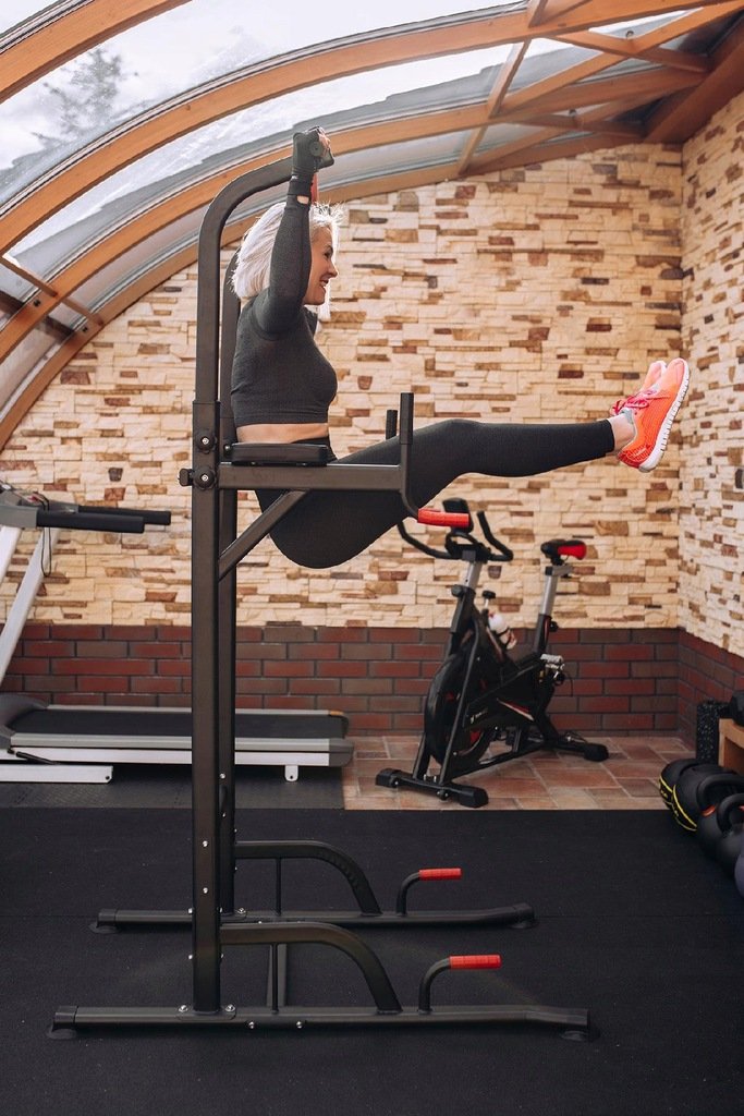 Drążek do podciągania o długości 98 cm posiada gumowe uchwyty na obu końcach oraz 5 stopniową regulację wysokości. Docenisz również miękkie poręcze wraz z oparciem do solidnego przećwiczenia mięśni brzucha oraz uchwyty do dipsów i uchwyty push-up na dole idealne do pompek.