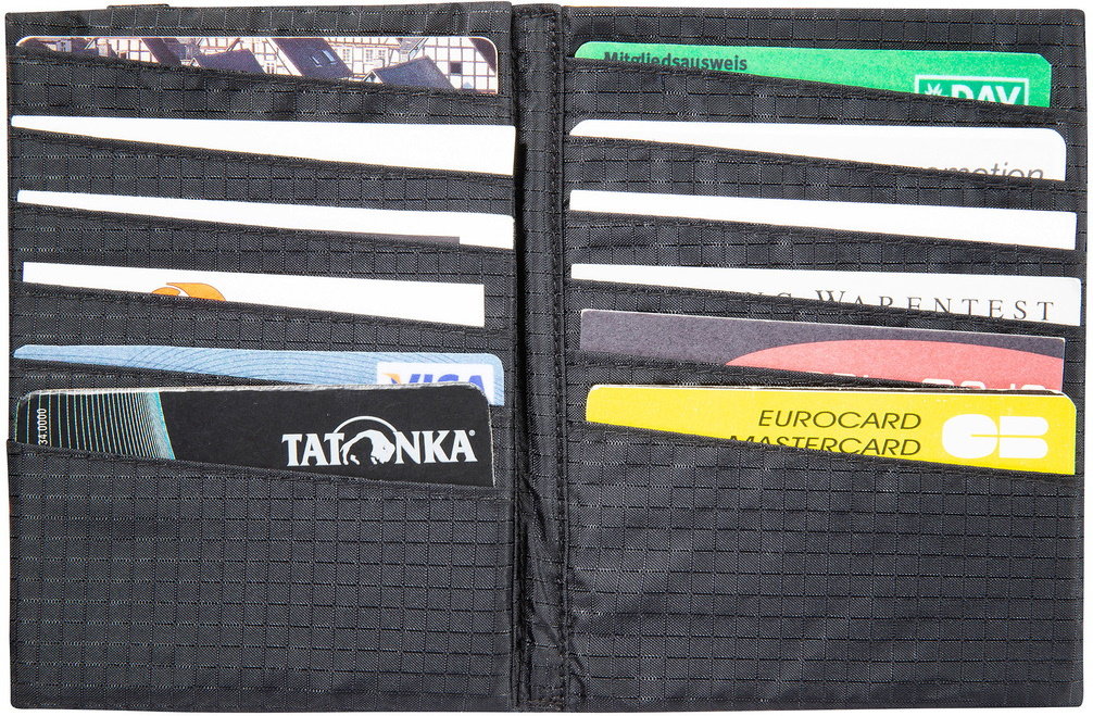 Składane etui z ochroną RFID przed kradzieżą danych. Dla co najmniej 12 kart kredytowych i bankomatowych, kart dostępu lub dokumentów tożsamości w formacie karty kredytowej.