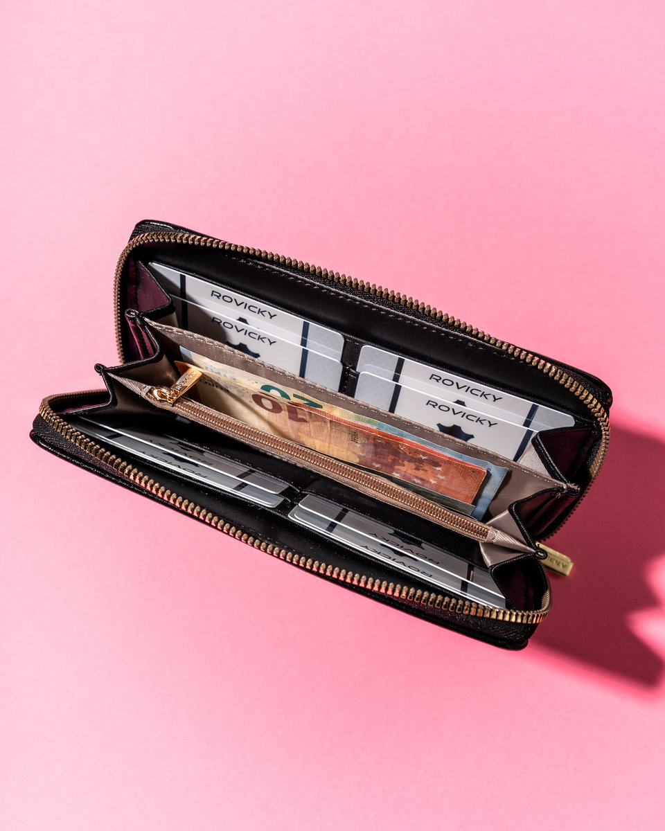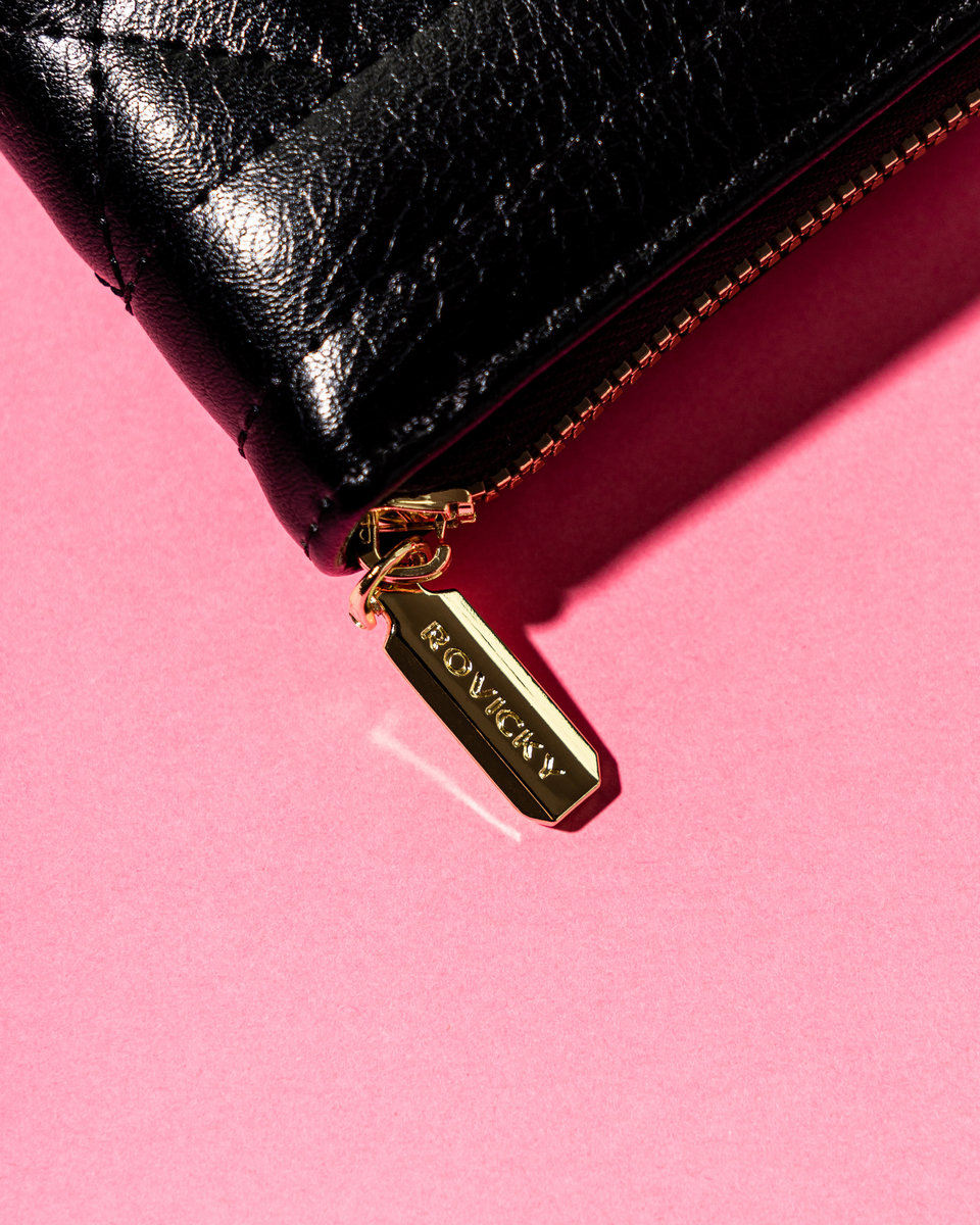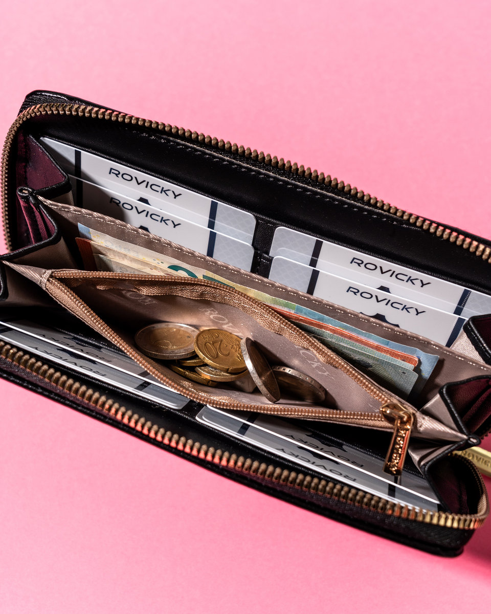 ✅ Suwak portfela również jest w złotym kolorze. Posiada on elegancką zawieszkę z nazwą marki Rovicky®. Zamek błyskawiczny dodaje funkcjonalności, jednocześnie estetycznie dopełnia całość tej kompozycji.