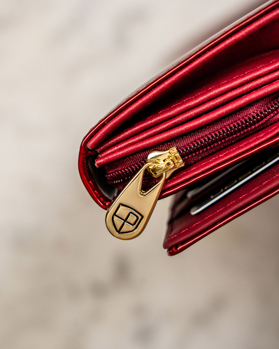 ✅ Zewnętrzna faktura portfela posiada charakterystyczny dla skóry lakierowanej, piękny połysk.