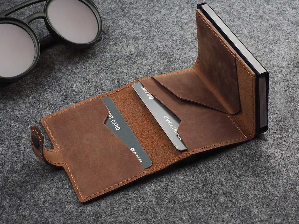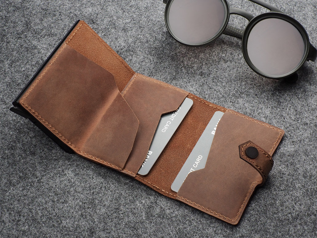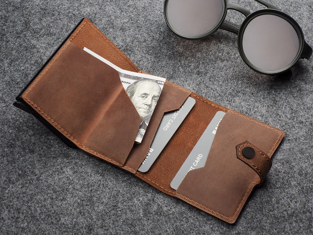 Dwie łatwo dostępne kieszonki idealnie zorganizują dokumenty, karty lub wizytówki. Dodatkowym atutem jest unikalna przegródka na banknoty, wykonana w całości ze skóry. Dzięki technologii blokowania RFID zastosowanej w designie portfela, Twoje wrażliwe dane oraz środki na kartach płatniczych są całkowicie bezpieczne i chronione przed nieautoryzowanym sczytaniem lub kradzieżą. Specjalny mechanizm stopniowego wysuwania kart pozwala szybko sięgnąć po tę, której szukamy.