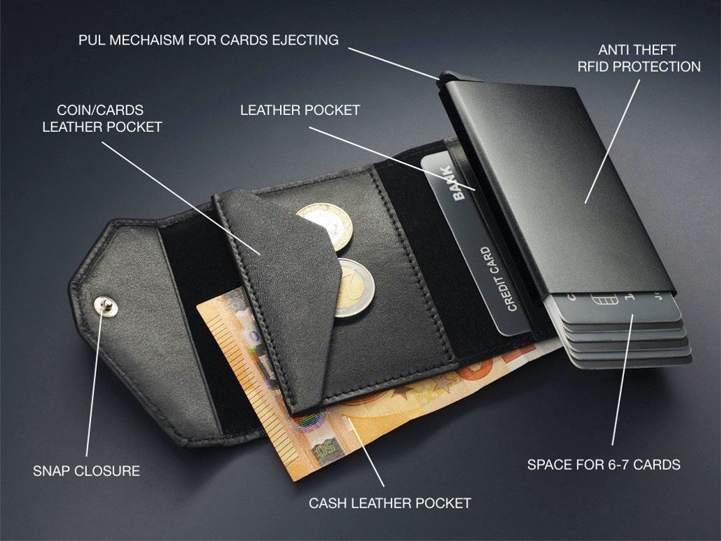 Wykonany z miękkiej w dotyku, ekskluzywnej skóry Italia w kolorze czarnym. Staranne wykończenie oraz subtelne przeszycia zadowolą każdego miłośnika perfekcyjnego detalu. Duża pojemność: portfel przechowa wiele kart i banknoty, a także niezbędny bilon - w eleganckiej, wewnętrznej kieszonce. Łatwa dostępność: specjalny mechanizm stopniowego wysuwania kart pozwala szybko sięgnąć po tę, której szukamy. Zastosowana w designie portfela technologia RFID zapewnia pełną ochronę Twoich kart płatniczych oraz dokumentów w każdym miejscu i o każdym czasie. Możesz odetchnąć spokojnie - wrażliwe dane osobowe oraz środki pieniężne są zabezpieczone przed kradzieżą lub nieautoryzowanym skanowaniem. Wzór zarejestrowany - niepowtarzalny i jedyny na rynku.