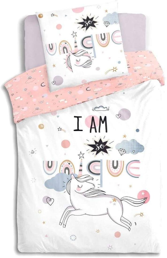 Komplet pościeli UNICORN to doskonały wybór dla rodziców, którzy chcą szybko i efektownie odmienić oblicze pokoju dziecięcego. Dzięki atrakcyjnemu wzornictwu i wysokiej jakości wykonania, stanie się on praktycznym i estetycznym dodatkiem, który z pewnością przypadnie do gustu Twojemu dziecku.