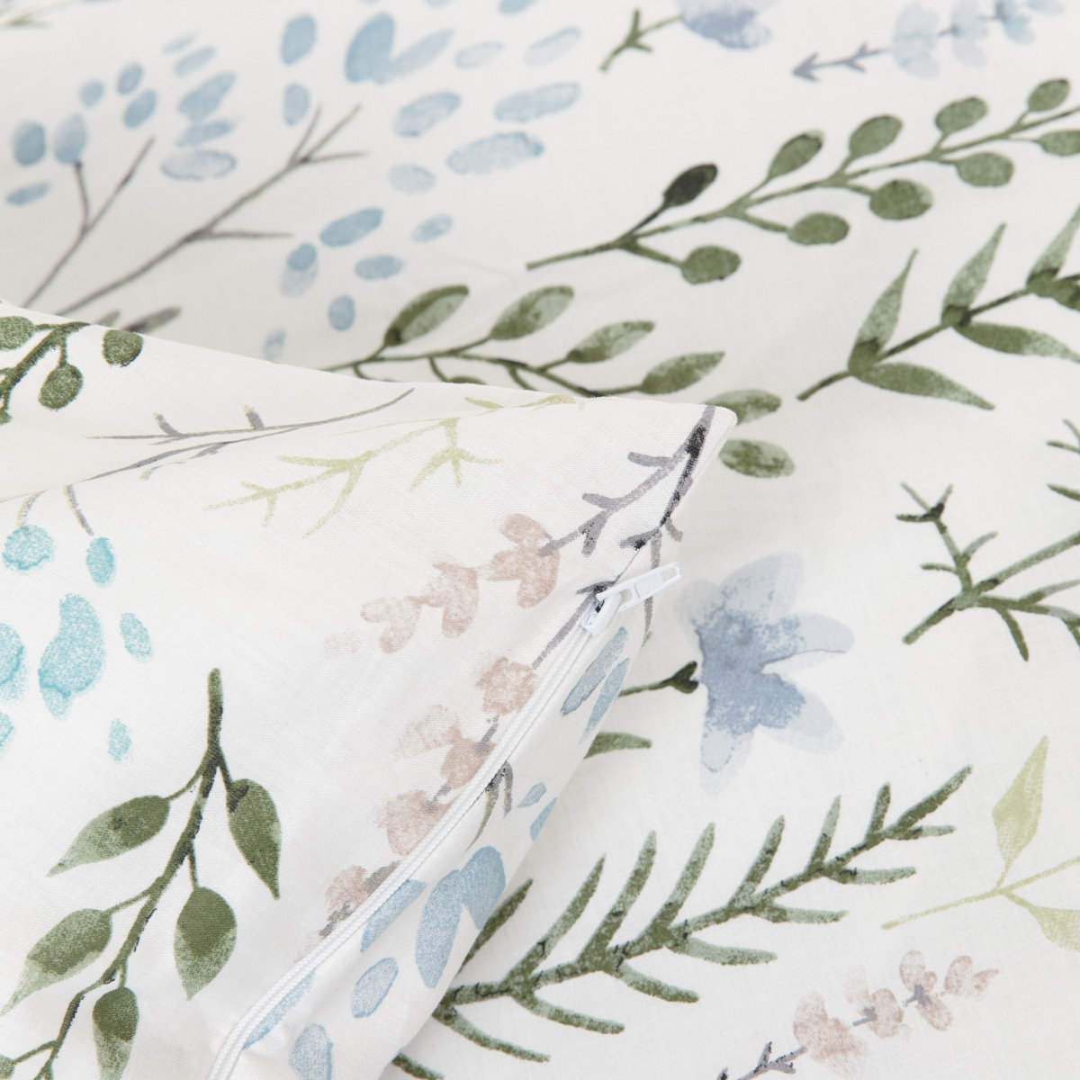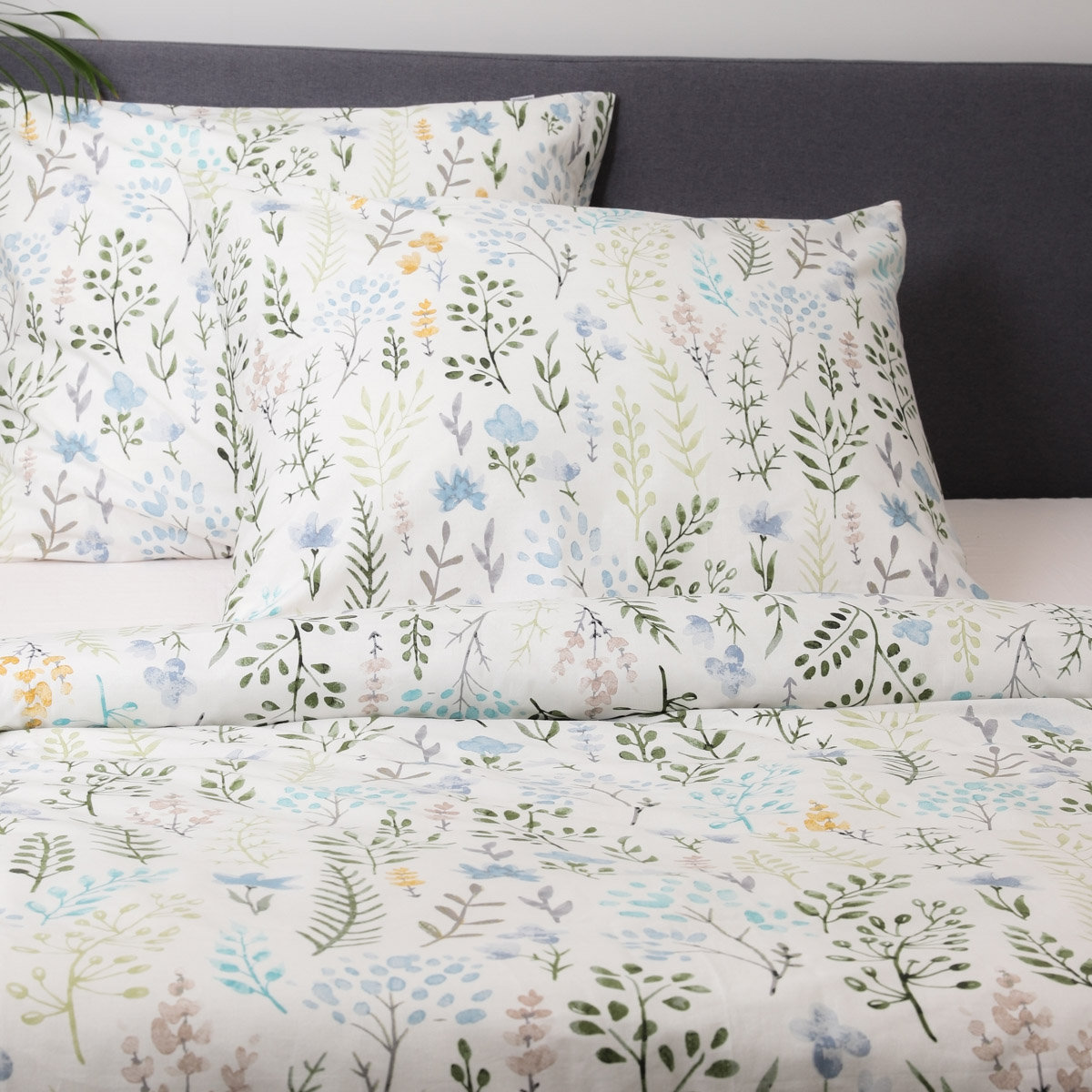 Komplet pościeli FORE składa się z poszwy na pościel o wymiarach 200 x 220 cm oraz dwóch poszewek na poduszkę o wymiarach 70 x 80 cm. Pościel jest zapinana na zamek błyskawiczny, co jest dużym ułatwieniem. FORE wygląda jakby była malowana akwarelami - na białym tle zostały umieszczone kwiaty oraz gałązki w stonowanych barwach.