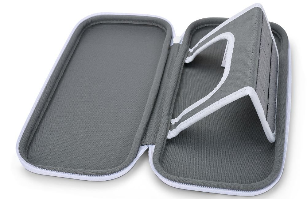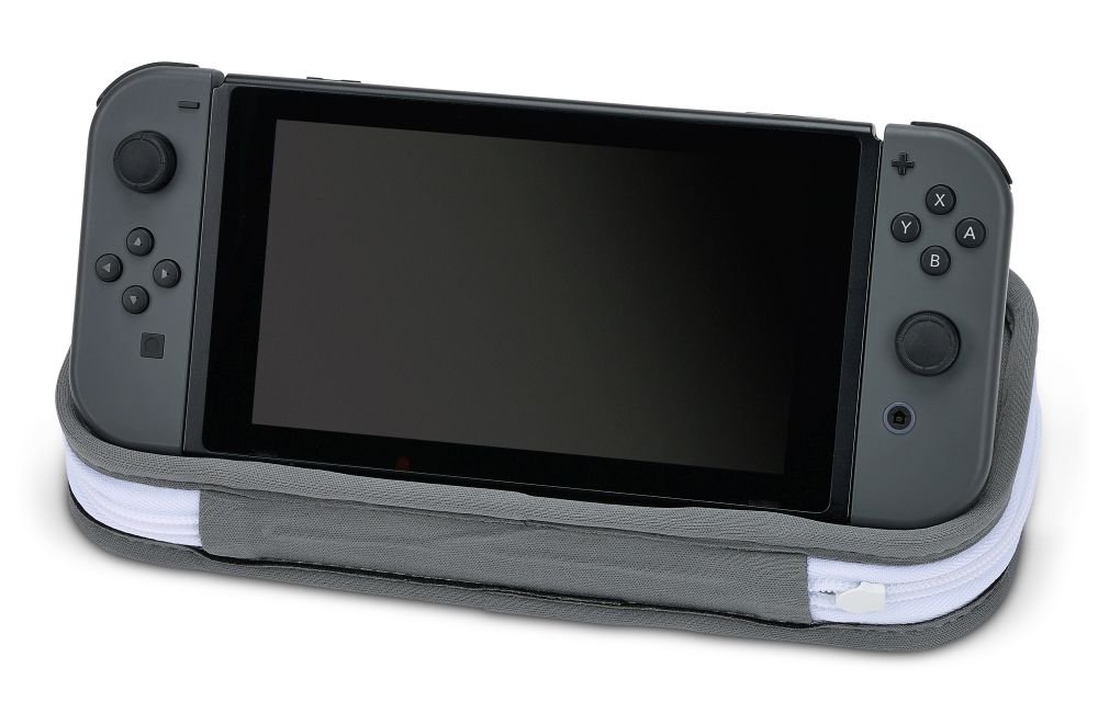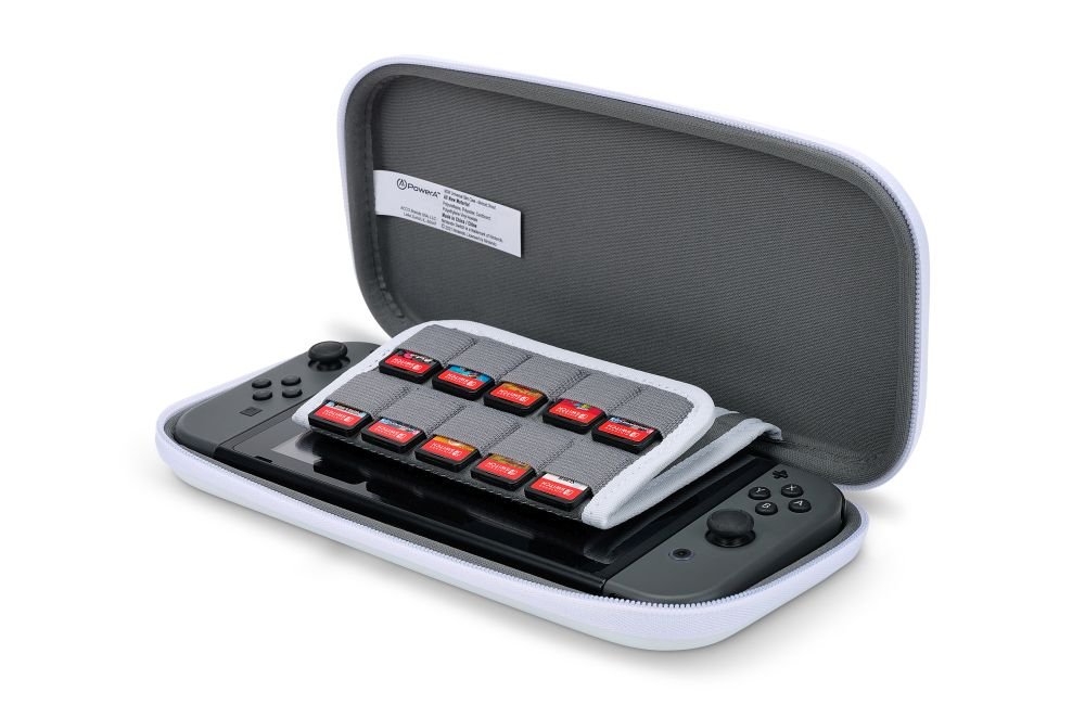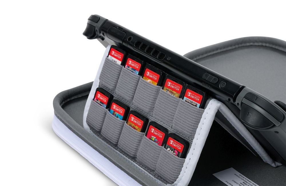 Zabierz swój model Nintendo Switch OLED, Nintendo Switch lub Switch Lite w smukłym etui, które zabezpieczy twój sprzęt przed zniszczeniem. Wewnątrz znajdziesz filcowany materiał i wbudowaną podstawkę z miejscem na dziesięć kart do gry.