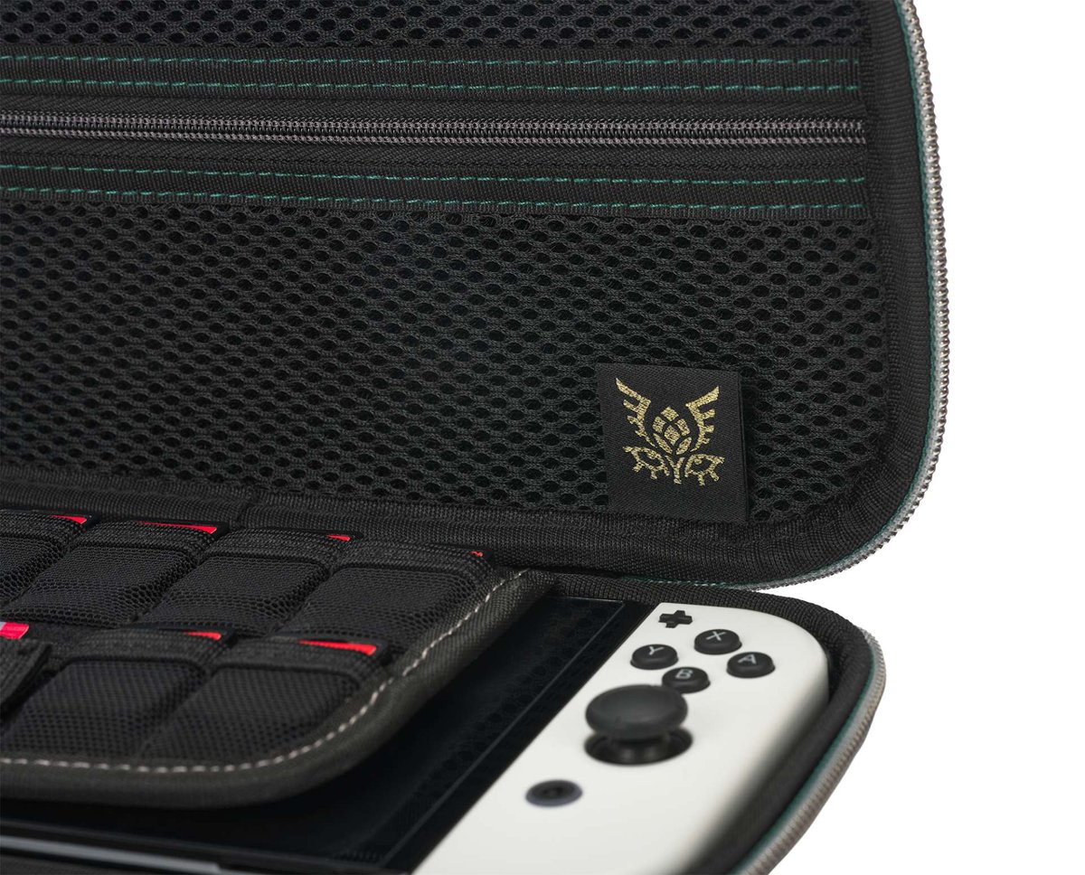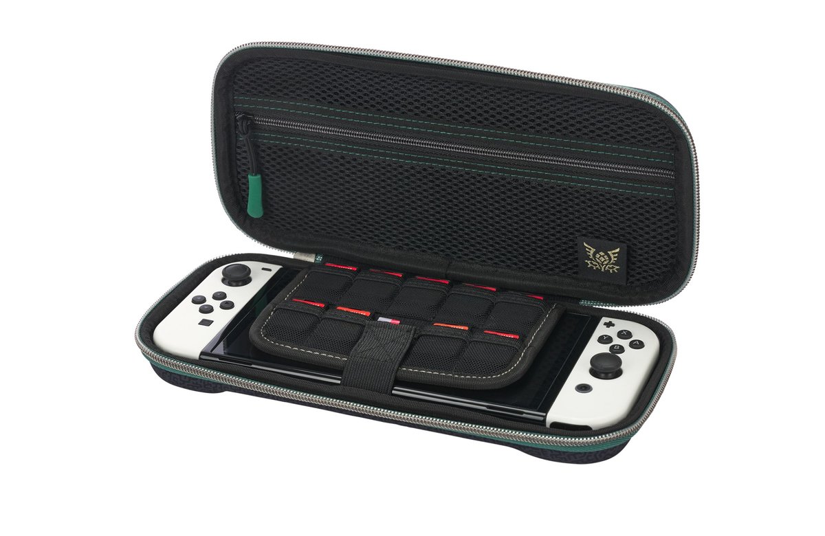 Wewnątrz znajdziesz filcową podszewkę, klapkę chroniącą ekran z miejscem na dziewięć kart do gry, plakietkę z logo i siatkową kieszeń zapinaną na zamek. To przenośne etui zapewnia swobodę zabawy w podróży dzięki konsoli Nintendo Switch. Gdziekolwiek. Zawsze.