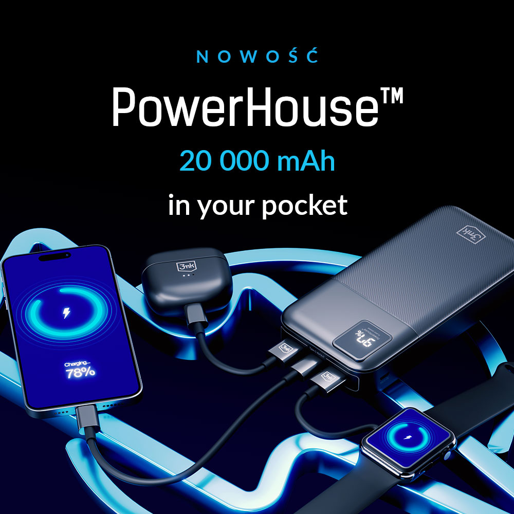 PowerHouse™ oferuje doskonałą pojemność 20 000 mAh w kompaktowej formie. Jest elegancki, lekki i poręczny. Na pewno nie będzie Ci ciążyć podczas przenoszenia. Zmieści się w plecaku, torebce, a nawet w kieszeni. Wydajna bateria litowo-polimerowa pozwoli Ci naładować smartfona do 100% aż 3 razy. Używanie PowerHouse™ to niebywała przyjemność – w domu, w biurze, w szkole, w trasie czy w plenerze.