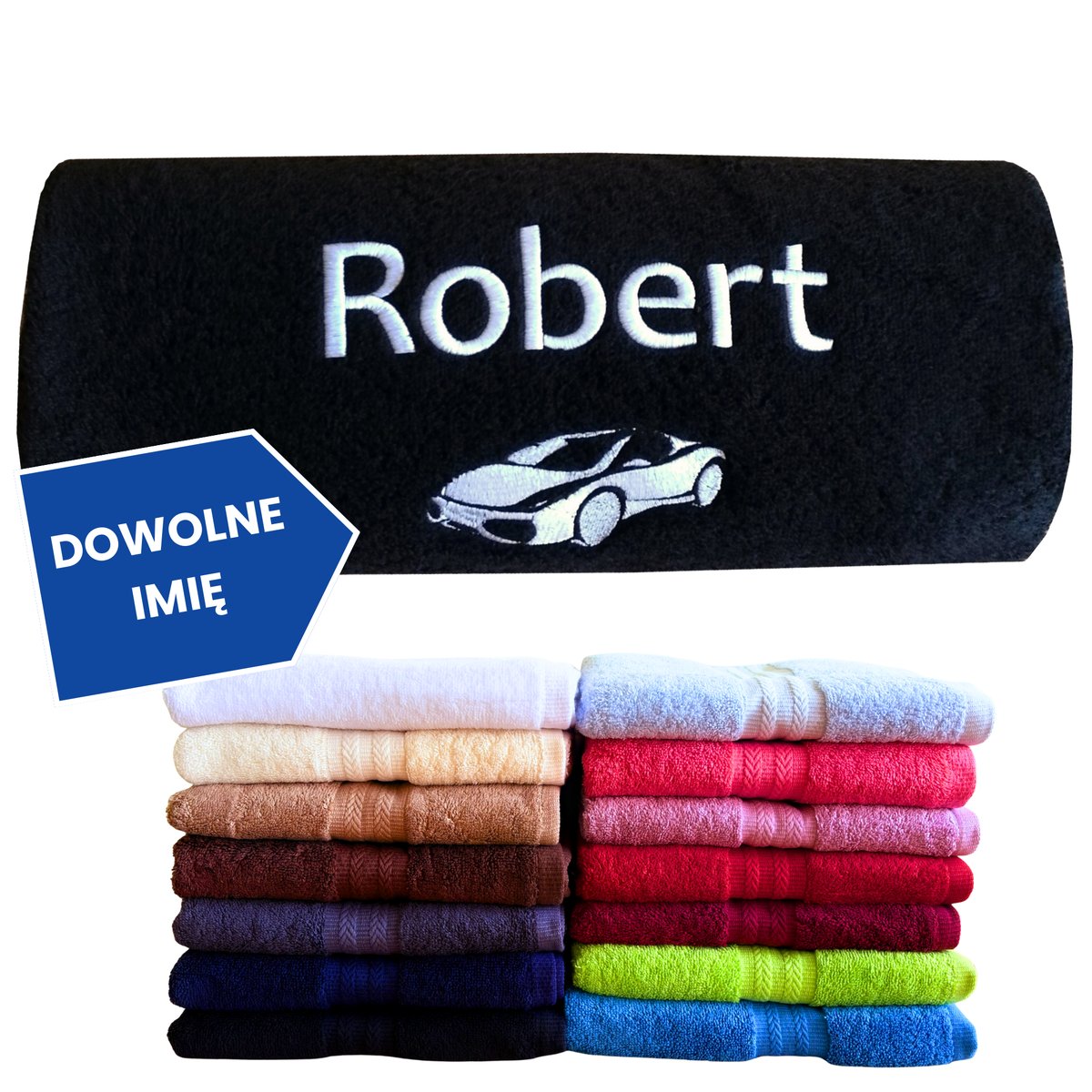 Oryginalny i praktyczny prezent dla każdego fana motoryzacji!✅ Duży ręcznik kąpielowy 70x140 cm z wyhaftowanym motywem graficznym samochodu i Twoim dowolnym imieniem