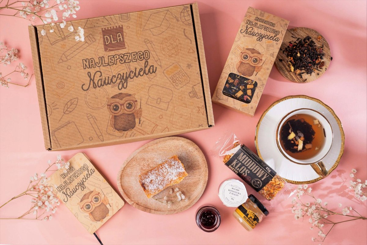 Zestaw prezentowy pełen kraftowych produktów z manufaktur w ciekawej szacie graficznej, prezent doskonały dla każdego nauczyciela