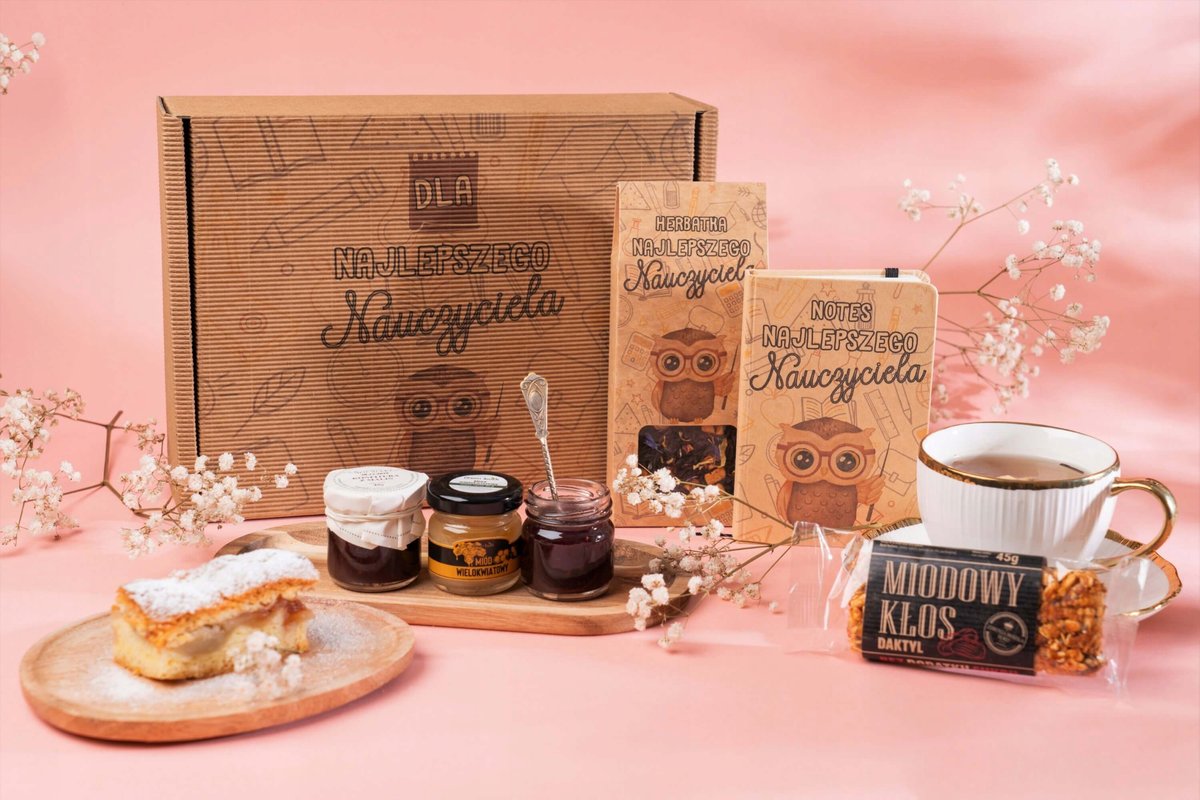 Prezent dla nauczyciela zestaw herbata notes miód baton konfitury upominek z nadrukiemKarbowane pudełko prezentowe z nadrukiem wypełnione po brzegi kraftowymi produktami premium, sprawdzi się jako ...
