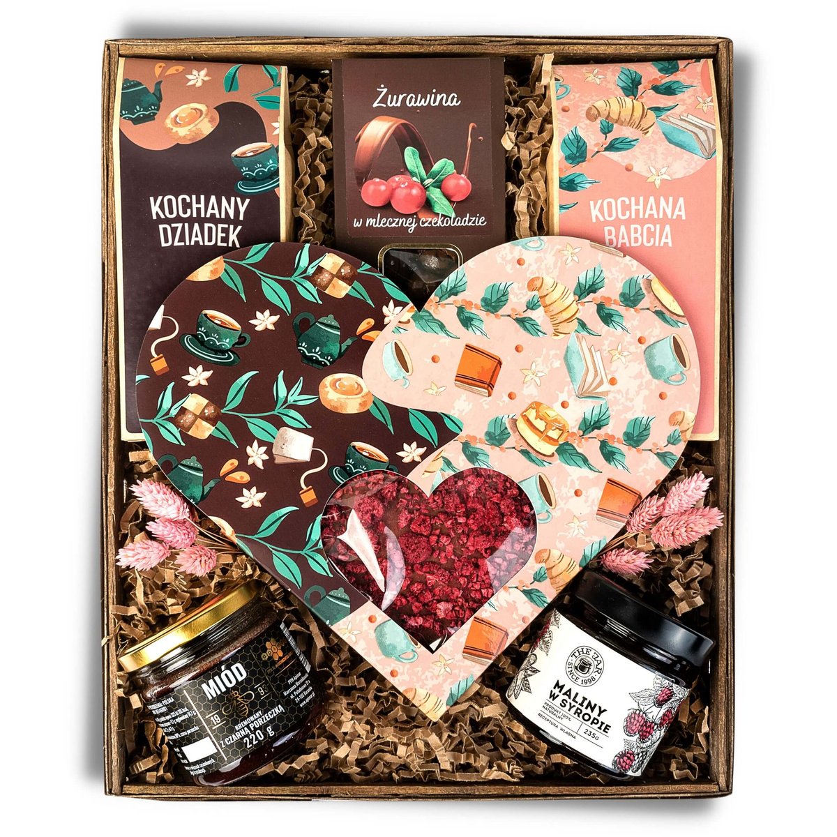 | Nazwa: | Prezent na dzień babci i dziadka kosz prezentowy serce czekolada, kawa i herbata zestaw z miodem |