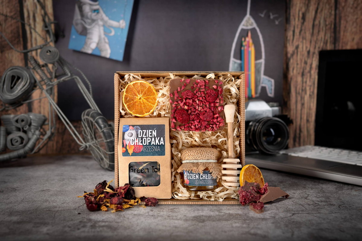 Prezent na dzień chłopaka zestaw upominek box eko Upominek z okazji Dnia Chłopaka – 30 września Naturalny upominek w postaci dobrej herbaty, miodu oraz ręcznie robionej czekoladki całość zamknięta w ...
