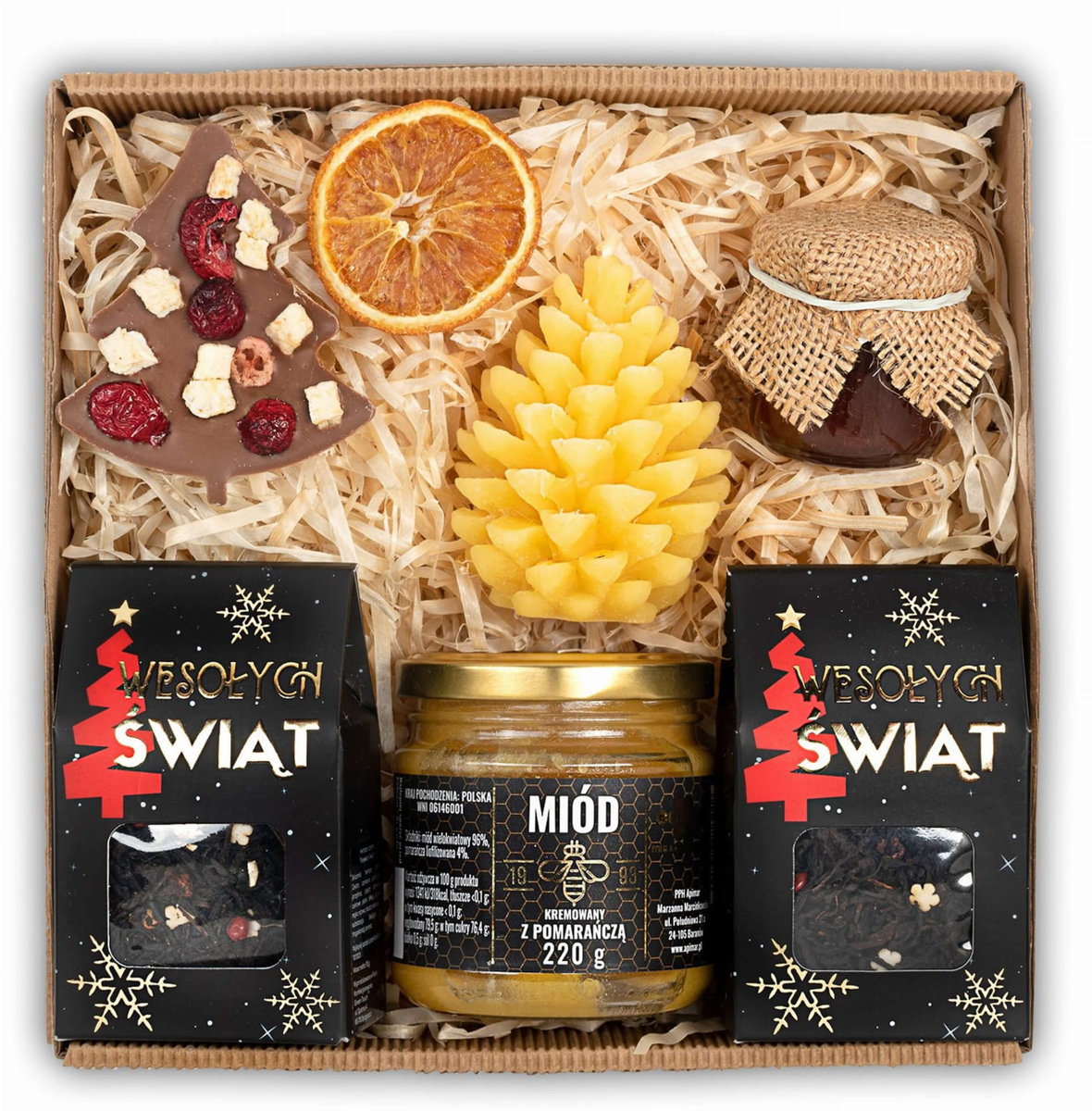 Świąteczny box prezentowy z herbatami;miodami;czekoladą i świecą Upominek nie musi być nudny! Dlatego włożyliśmy do pudełka świąteczne produkty;które są naprawdę przepyszne i w pełni natural ...