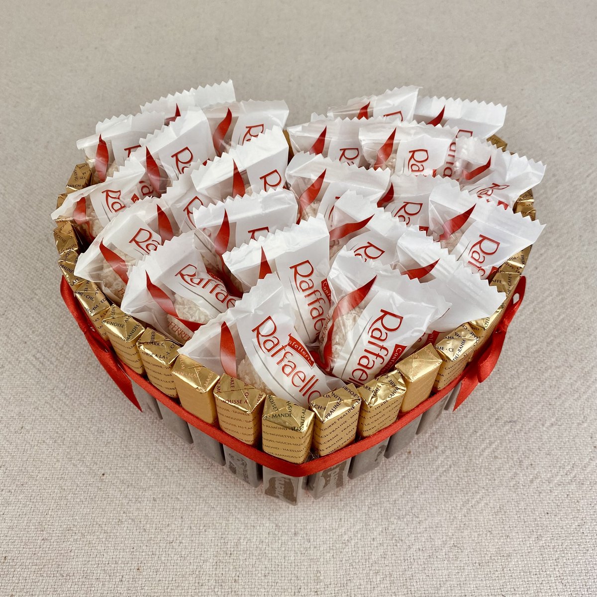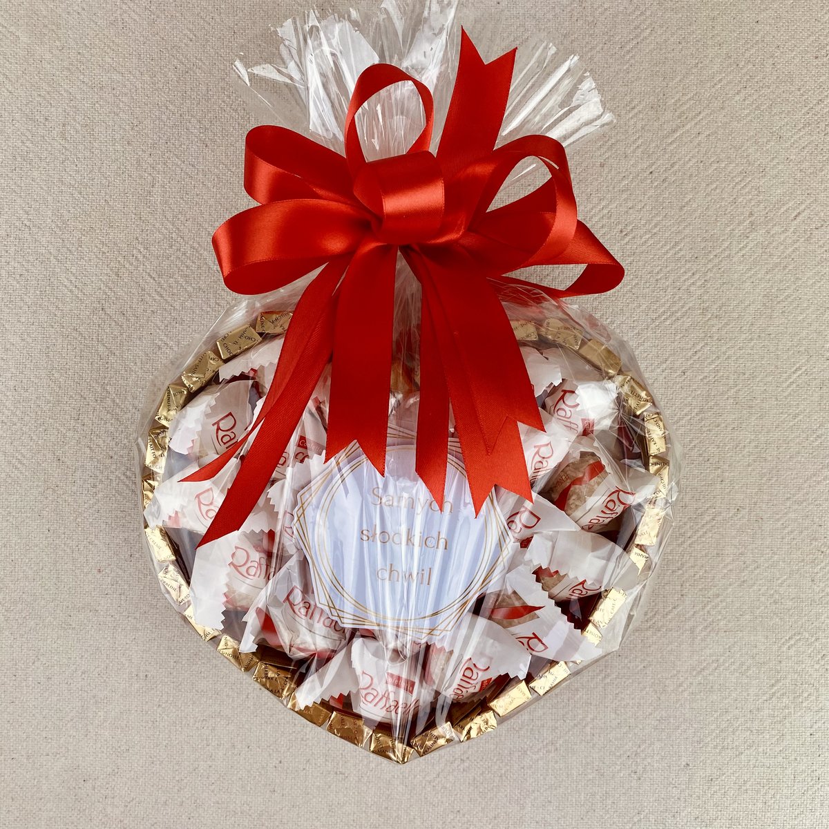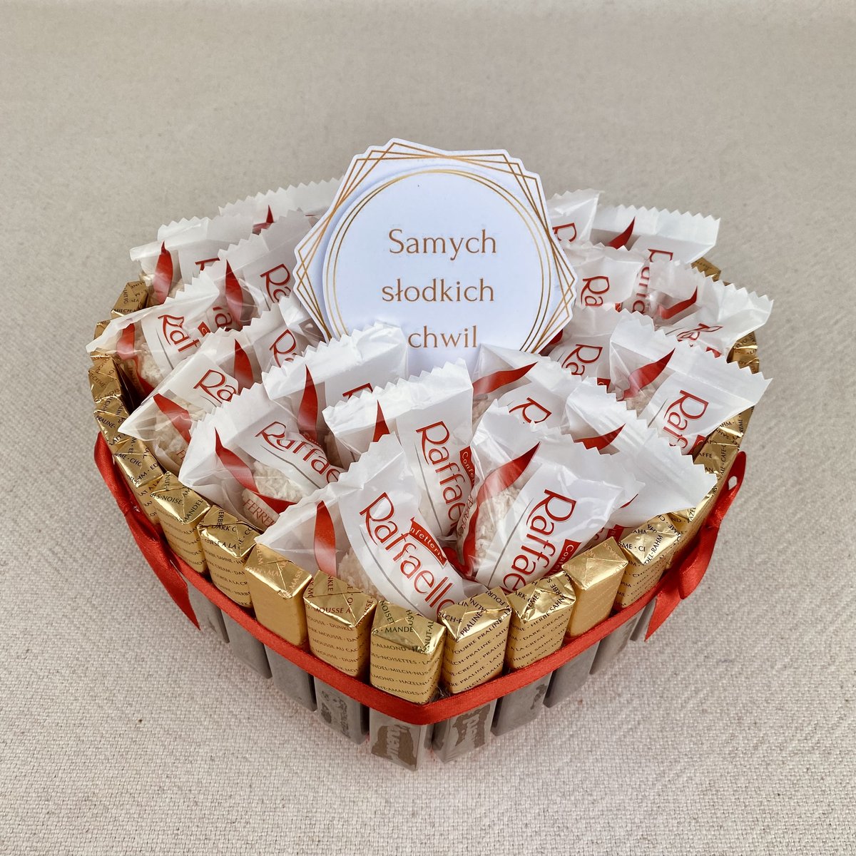 Przedstawiamy oryginalny prezent;jakim jest słodkie serce. Prezent wykonany z markowych pomadek Merci oraz Raffaello. Prawdziwa uczta dla zwolenników słodkości!