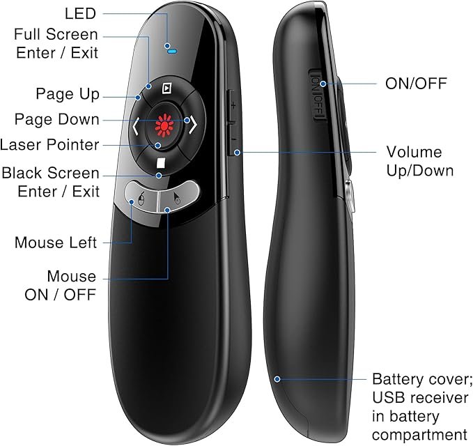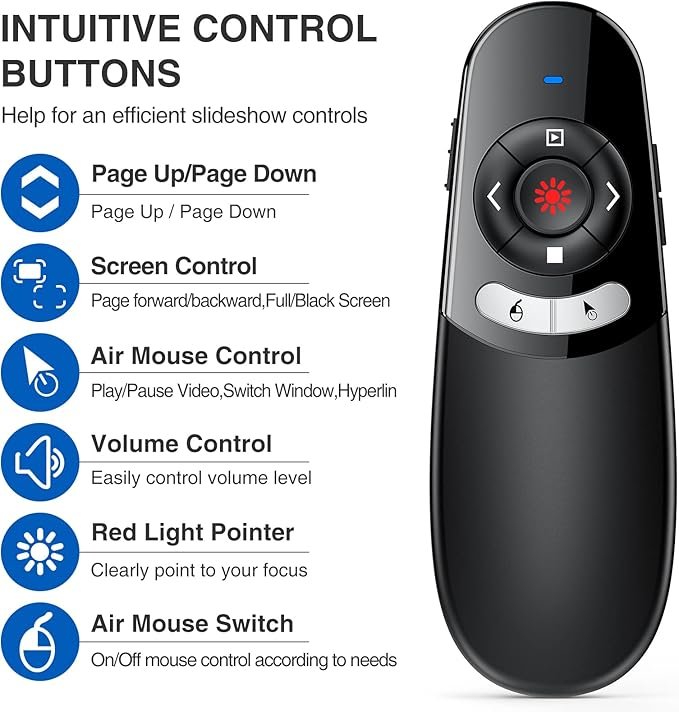 - Pełna funkcjonalność: Obsługuje pięć kluczowych funkcji, takich jak hiperłącze, regulacja głośności, zmiana okna, czarny/pełny ekran oraz nawigacja slajdów do przodu i do tyłu, co pozwala na łatwe zarządzanie prezentacją.