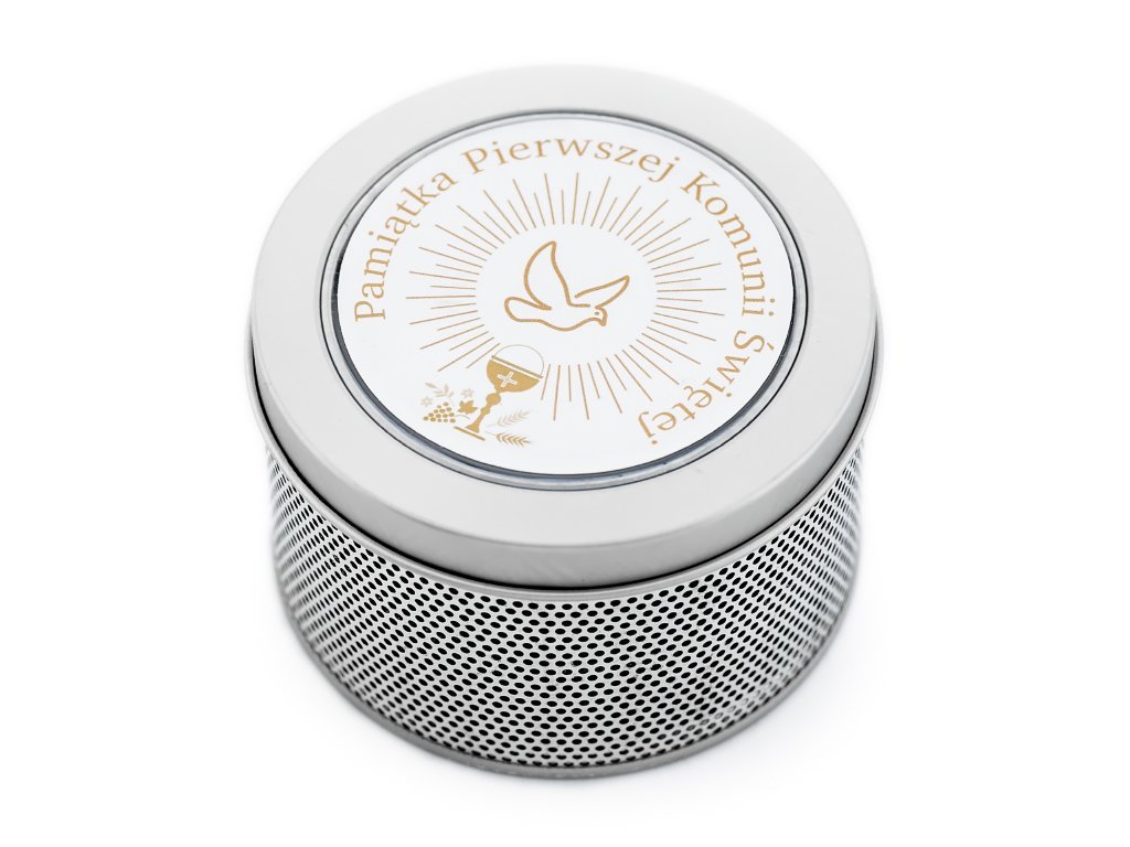 Pudełko metalowe wyłożone gąbką. Na pokrywce ozdobny napis "Pamiątka Pierwszej Komunii Świętej".