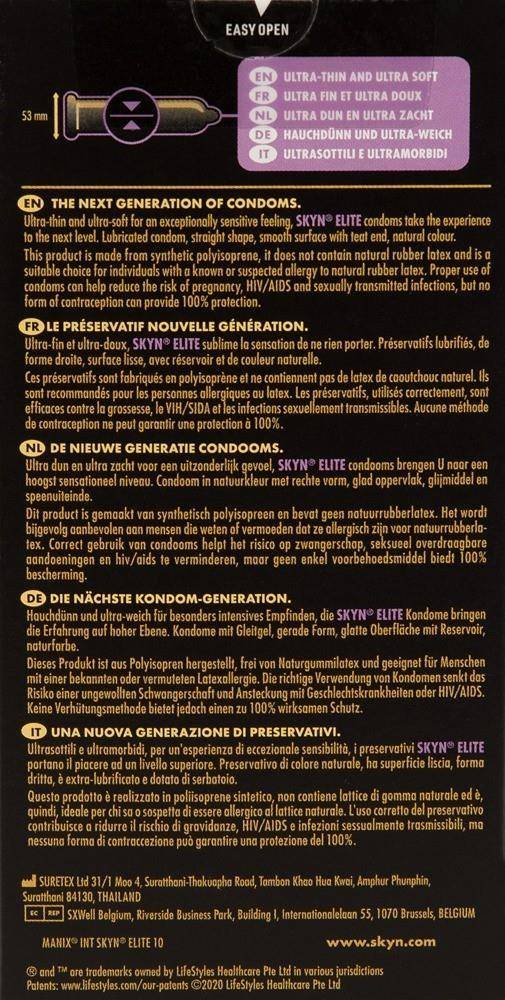 Prosty kształt, ze zbiorniczkiem, nawilżane, gładka powierzchnia, naturalny kolor, 53 mm szerokości. Prezerwatywy Skyn® są wykonane z poliizoprenu, naukowo opracowanego materiału, który jest delikatniejszy od lateksu i zapewnia bardziej naturalne odczucia, a ponadto wzmacnia doznania, co potwierdzają testy kliniczne. Łączy wytrzymałość najlepszego lateksu z delikatnością ultra-cienkiej prezerwatywy. Teraz cieńsze i bardziej delikatne*, prezerwatywy Skyn® Elite zapewniają jeszcze bardziej naturalne doznania, wprowadzając nowy poziom odczucia to jakby nie mieć nic na sobie™. Prezerwatywy ze zbiorniczkiem oraz delikatnym i wyjątkowo długotrwałym środkiem nawilżającym. Każda prezerwatywa jest testowana elektronicznie, by spełniać najwyższe standardy bezpieczeństwa i niezawodności. *w porównaniu do SKYN® Original.