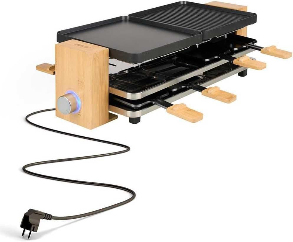 Z Raclette Pure 8 marki Princess 162918 możesz delektować się kolacją z rodziną lub przyjaciółmi w atmosferze czystego luksusu. Po użyciu garnki można bezpiecznie i łatwo schować w unikalnej oponie parkingowej. Ten raclette jest odpowiedni dla maksymalnie 8 osób, dzięki czemu idealnie nadaje się do dużych grup. Raclette jest wykończony luksusowym, naturalnym materiałem bambusowym, dzięki czemu będzie również pięknym dodatkiem do Twojego wnętrza!