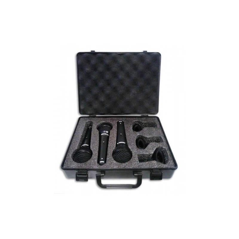 3 mikrofony dynamiczne. Zestaw dedykowany do aplikacji wymagających klarowności i ciepłego dźwięku. Kardioidalna charakterystyka. Szerokie pasmo przenoszenia. Wyłącznik on/off. W zestawie 3 uchwyty mikrofonowe.