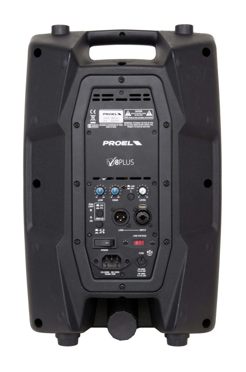V8PLUS posiada niezwykle wydajny moduł wzmacniacza zdolny do dostarczenia 400 W solidnej mocy do przetworników. Dzięki zastosowaniu technologii SMPS, moc ta zawarta jest w ultra lekkim opakowaniu, co czyni modele V PLUS najbardziej przenośnymi głośnikami PROEL w historii. Moduł zasilania umieszczony jest w całkowicie szczelnej aluminiowej obudowie, która zapewnia ochronę, doskonałą izolację obudowy od zewnątrz i niezwykle wydajne chłodzenie.
