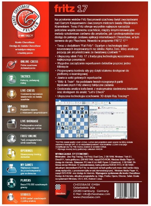 Na przełomie wieków Fritz fascynował szachowy świat zwycięstwami nad Garrym Kasparowem i ówczesnym mistrzem świata Władimirem Kramnikiem. Obecnie Fritz oferuje wszystkie najlepsze narzędzia potrzebne współczesnemu szachiście, między innymi innowacyjne metody szkoleniowe zarówno dla amatorów, jak i profesjonalistów oraz dostęp do pełnego zestawu aplikacji internetowych ChessBase, w tym serwera do gry Playchess. Nowości w programie FRITZ 17 *