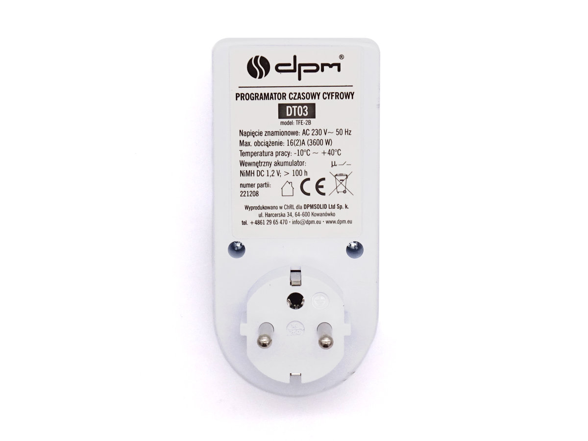Programator czasowy cyfrowy D0T3 DPM Maksymalne obciążenie: 16 A (3680 W). Dokładność ustawiania czasu: 1 min. Gniazdo z uziemieniem. Wewnętrzny akumulator NiMH 1,2 V.
