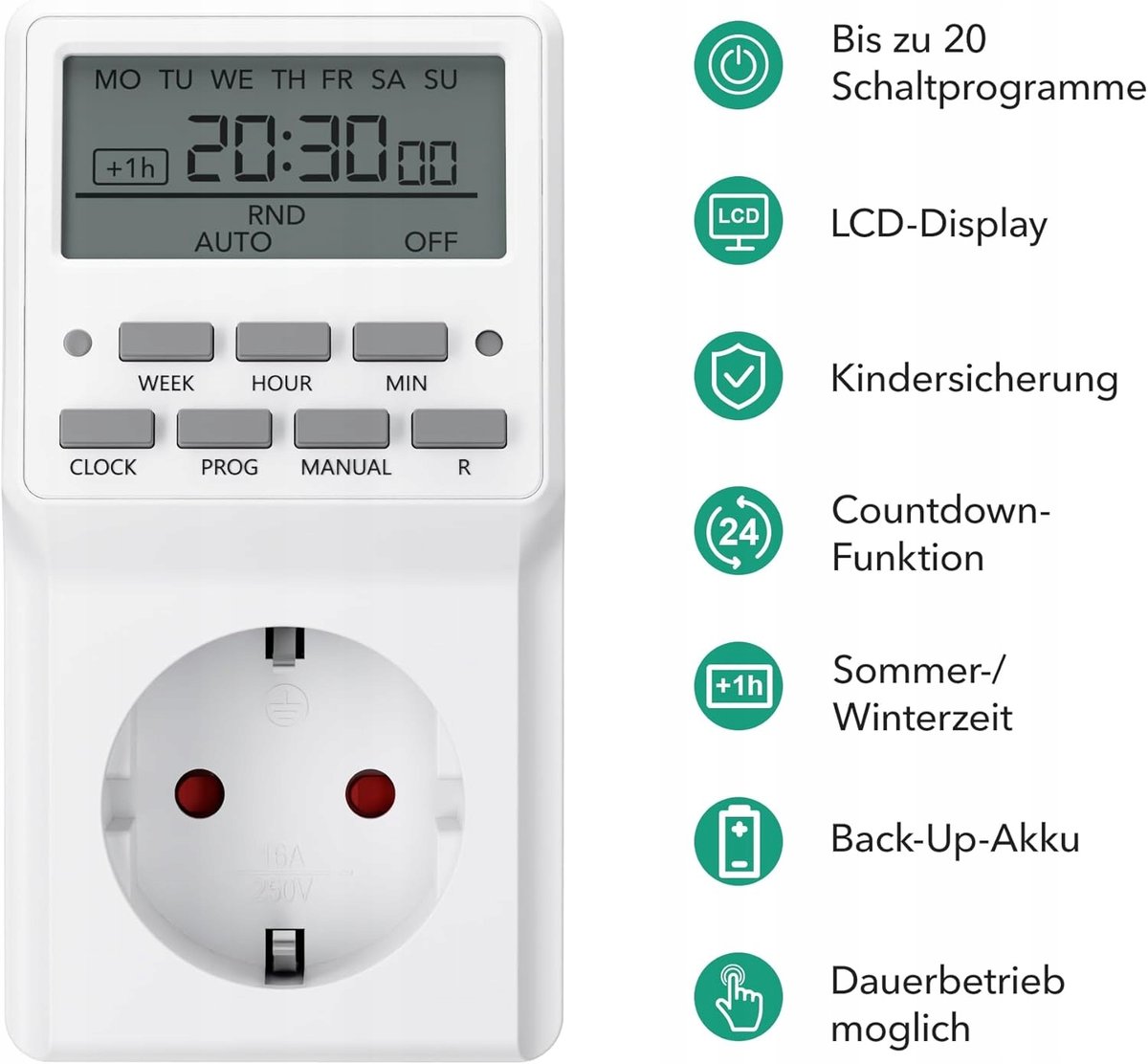 Automatyczne włączanie i wyłączanie: dzięki programowaniu z dokładnością do minuty, automatycznie włączasz i wyłączasz podłączone urządzenia. Maks. Możliwe 20 razy dziennie włączania i wyłączania.