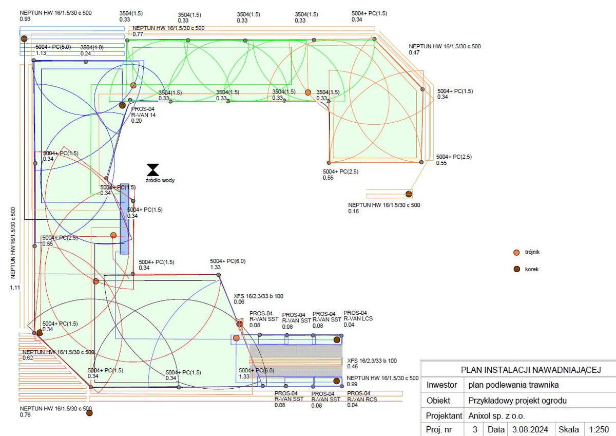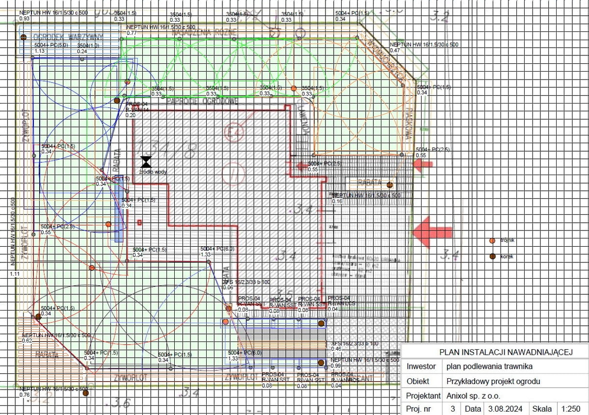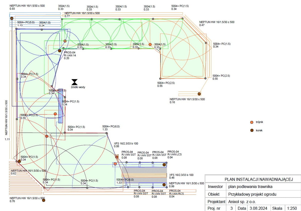 W projekcie różnymi kolorami oznaczone są poszczególne sekcje zraszaczy i linią kroplującą.