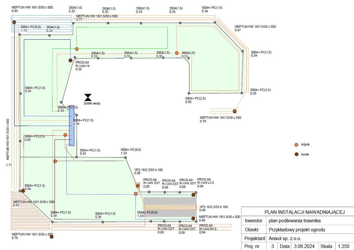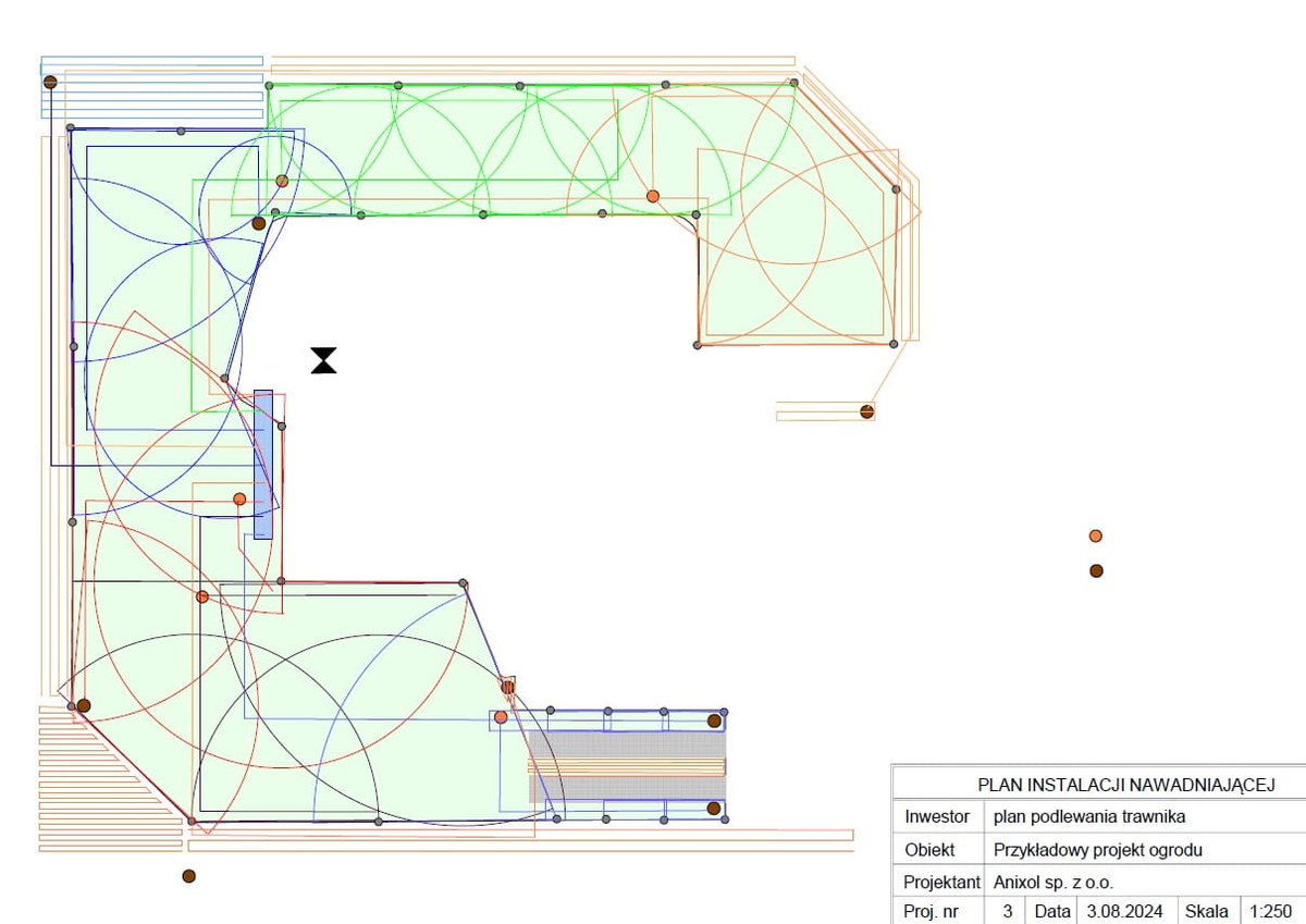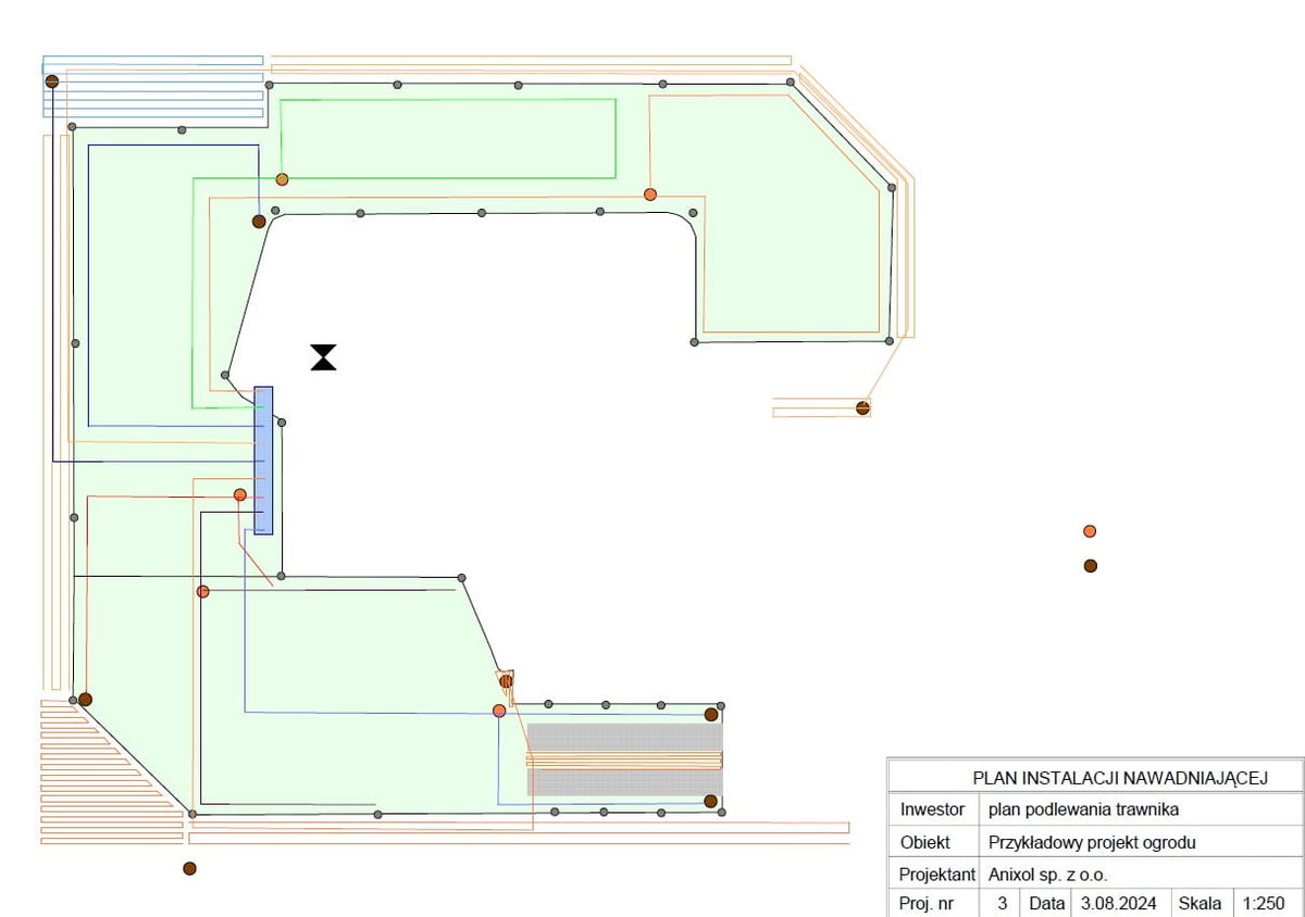 - Projekt rozmieszczenia zraszaczy, mikro zraszaczy, linii kroplujących, rur głównych doprowadzających wodę od kolektora wodnego do elementów wykonawczych.