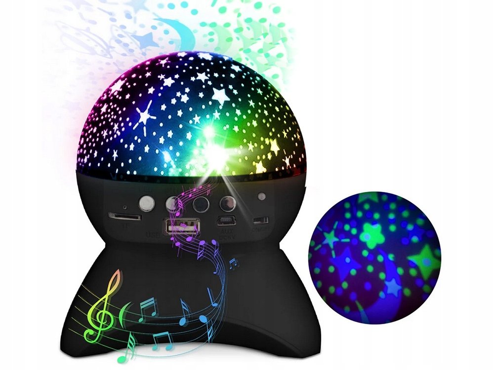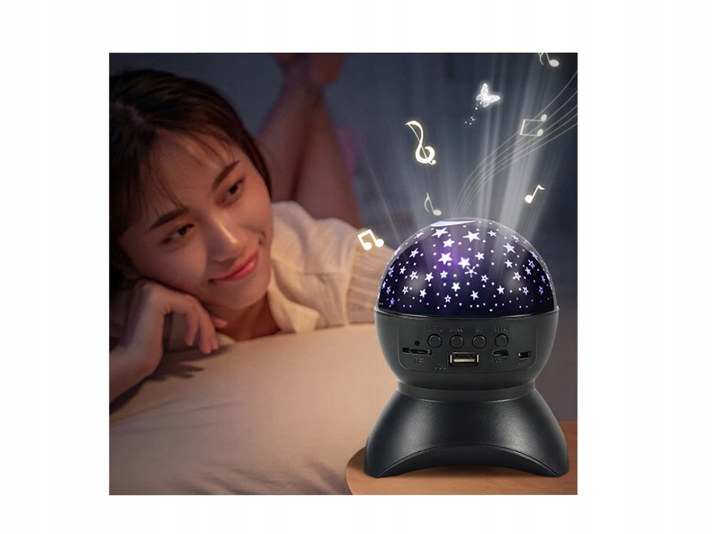 Projektor posiada wejście na kartę micro SD, USB, wejście do ładowania DC 5V i bluetooth. Możemy więc odtwarzać muzykę zarówno ze swojego pendrive jak i puszczać muzykę z telefonu. Głośnik w tym małym urządzeniu są naprawdę głośny. Urządzenie idealnie sprawdzi się przy małych dzieciach, którym na dobranoc można stworzyć piękny nastrój gwiezdnego nieba puszczając przy tym ulubioną kołysankę czy bajkę na dobranoc.
