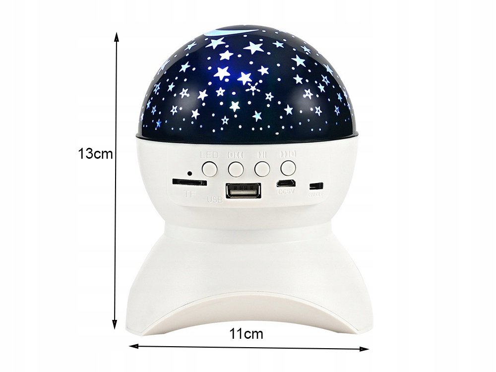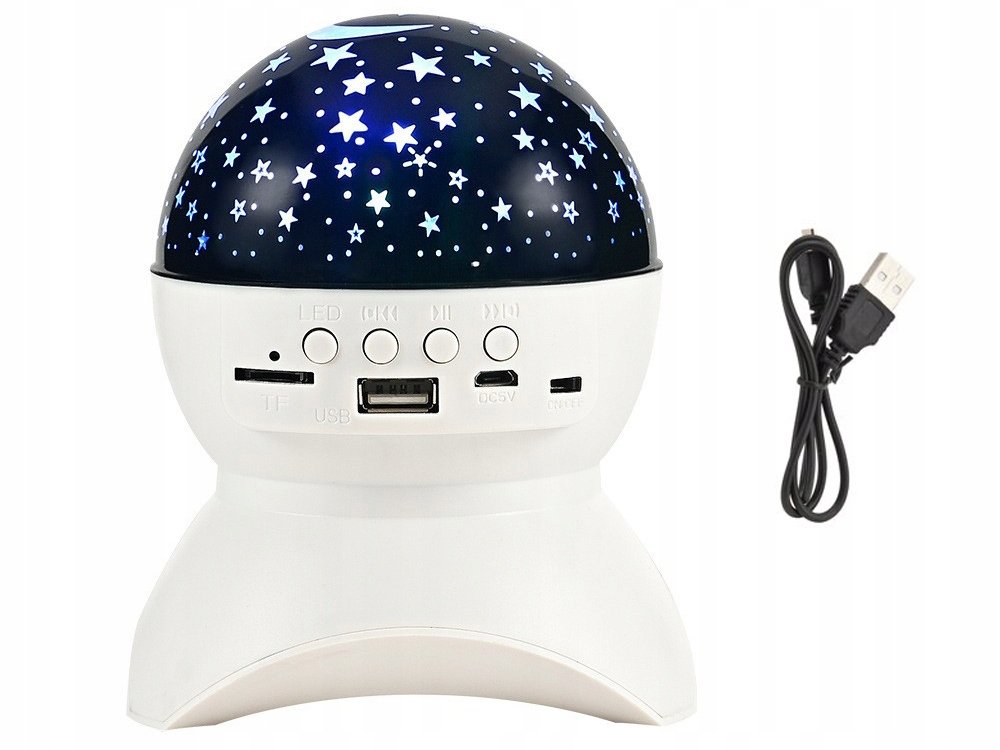 Projektor posiada wejście na kartę micro SD, USB, wejście do ładowania DC 5V i bluetooth. Możemy więc odtwarzać muzykę zarówno ze swojego pendrive jak i puszczać muzykę z telefonu. Głośnik w tym małym urządzeniu są naprawdę głośny. Urządzenie idealnie sprawdzi się przy małych dzieciach, którym na dobranoc można stworzyć piękny nastrój gwiezdnego nieba puszczając przy tym ulubioną kołysankę czy bajkę na dobranoc.
