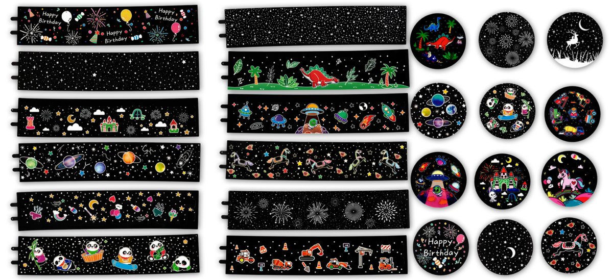 Te projekcyjne paski i kółka są wykonane z trwałych materiałów i zaprojektowane tak, aby łatwo pasowały do projektora Heckermann, umożliwiając bezproblemową zmianę motywów zgodnie z potrzebami i preferencjami użytkownika.