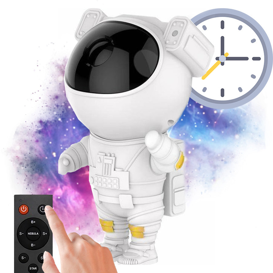 Projektor astronauta posiada wbudowany timer do odmierzania czasu, który działa według dwóch opcji: 45 minut i 90minut. Po tym czasie projekcja automatycznie się wyłącza.