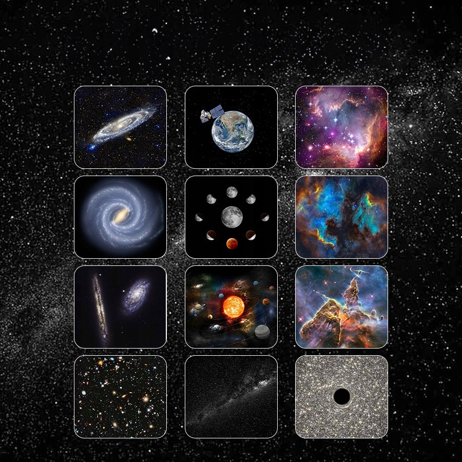 Urządzenie zostało wyposażone w aż 12 wymiennych wkładów, a każdy z nich wyświetli projekcję kosmosu. która w mgnieniu oka zmieni Twój pokój!