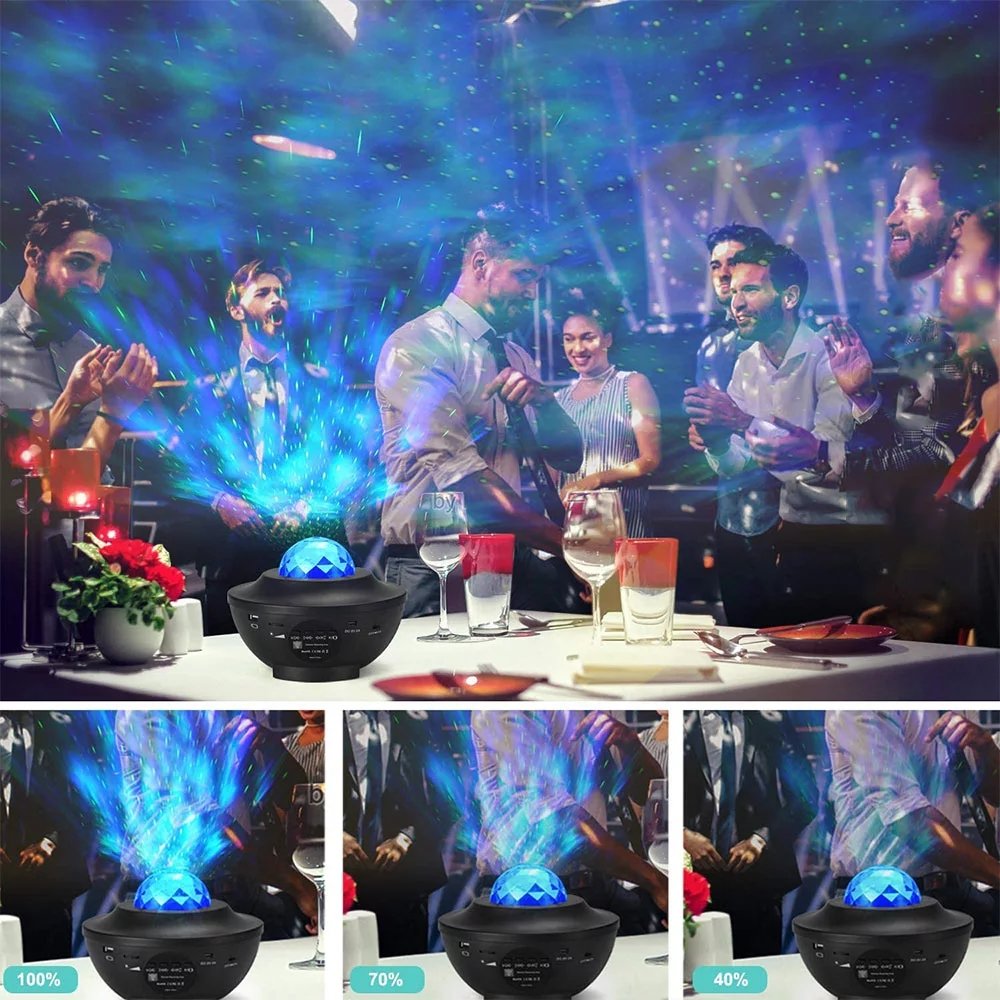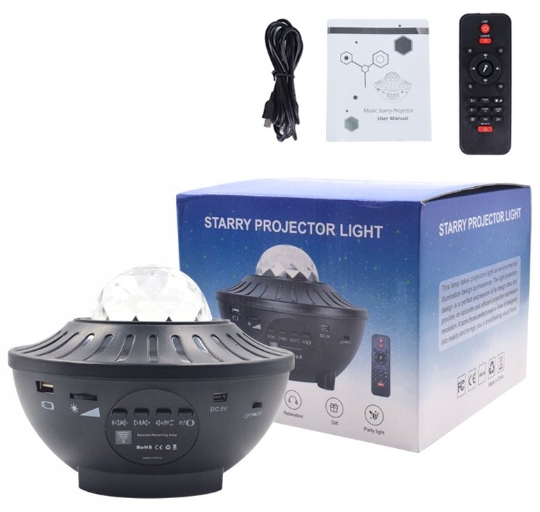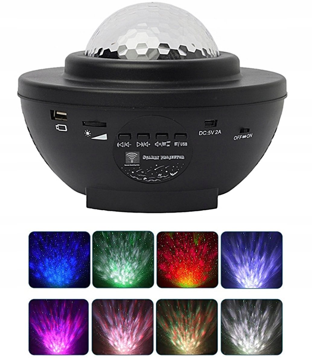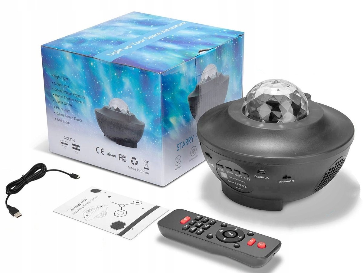 PROJEKTOR GWIAZD NIEBA I OCEANU, LAMPKA NOCNA LED Z GŁOŚNIKIEM Opis funkcji urządzenia:- Kombinacje kolorystyczne - aż 10 różnych trybów,- Paleta kolorów - niebieski, czerwony,