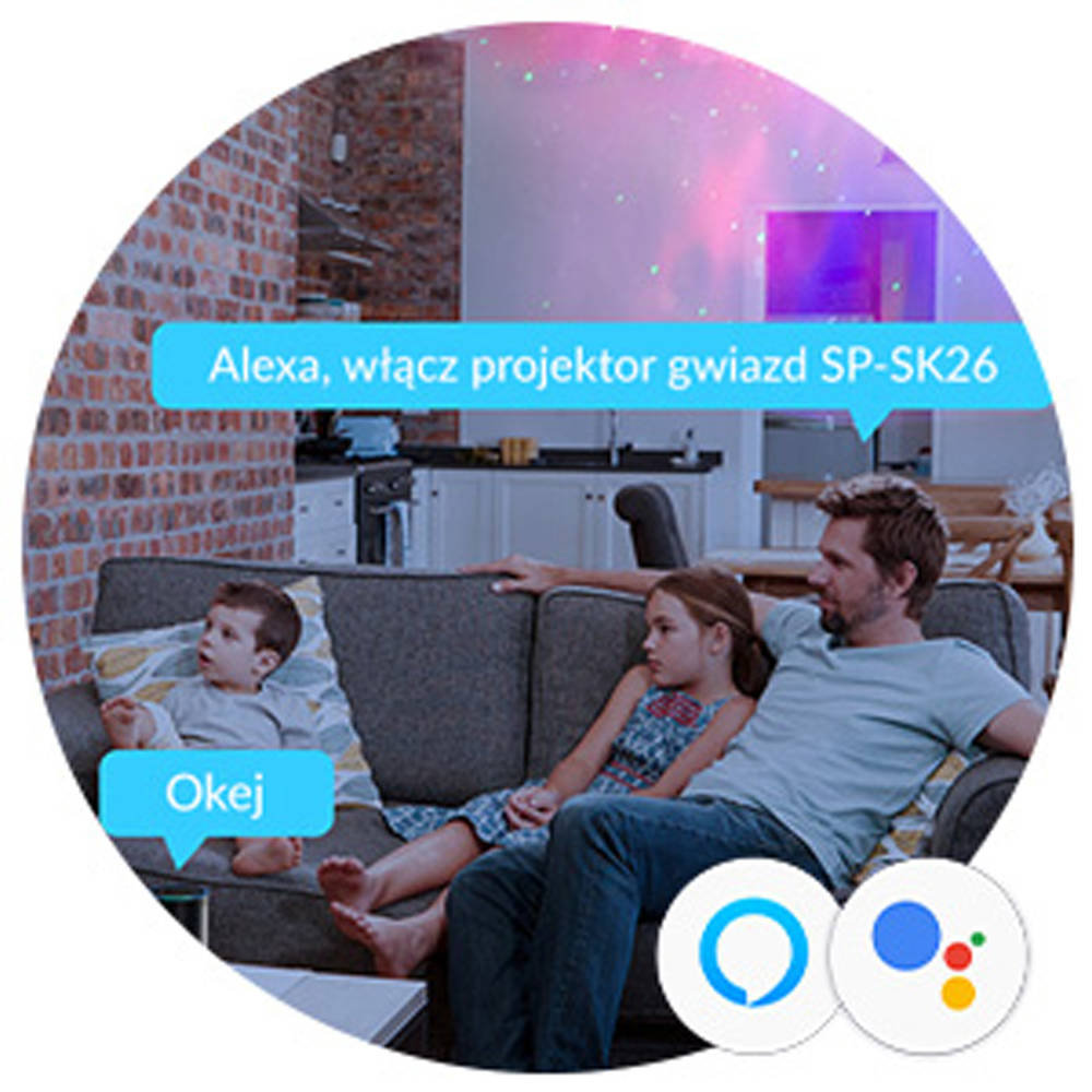 Steruj wyświetlaczem gwiazd bez wstawania z kanapy i chwytania za telefon. Wydawaj polecenia głosowe po podłączeniu Alexy lub Asystenta Google.