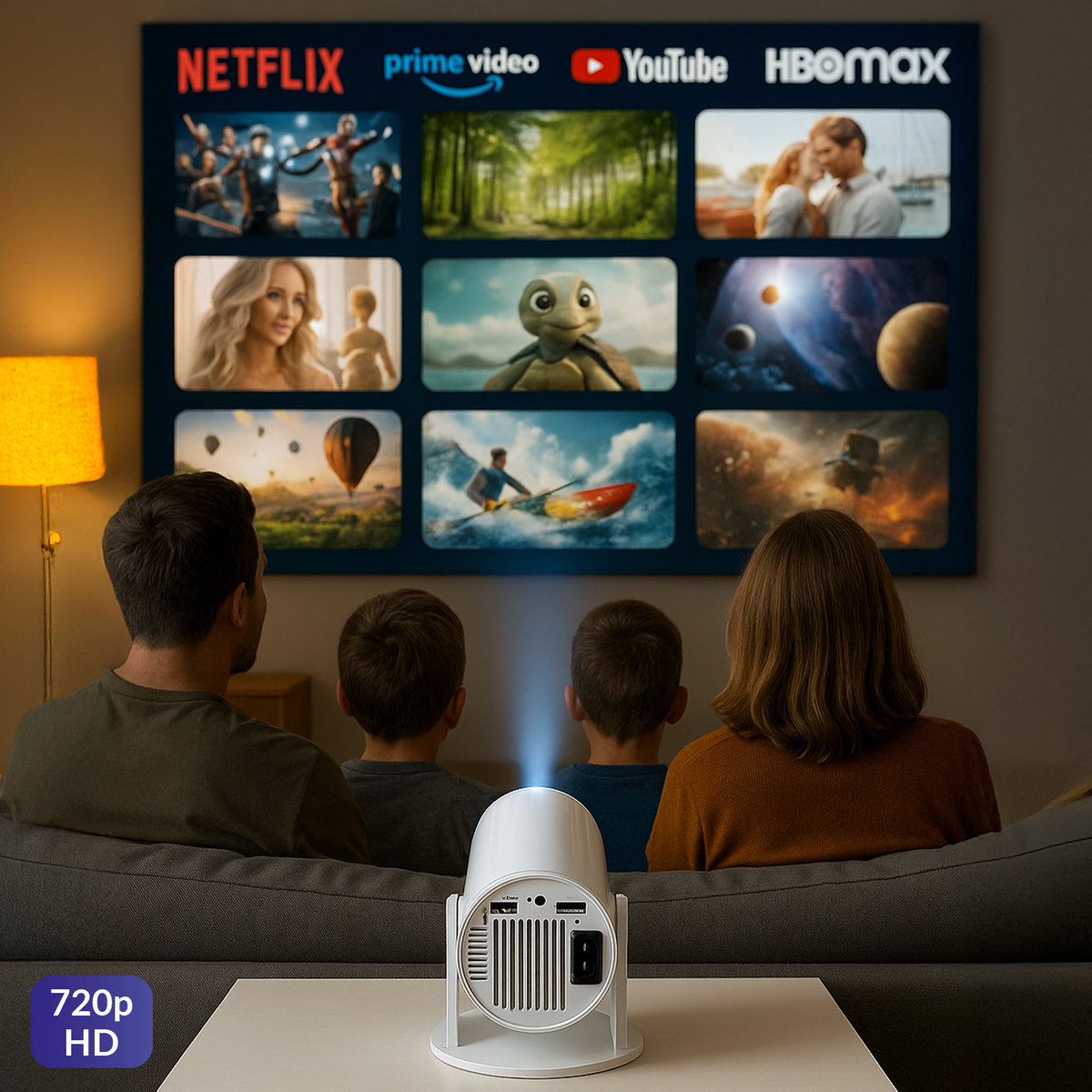 Wi-Fi, Bluetooth, HDMI, USB – projektor zapewnia pełną swobodę wyboru źródła. Udostępniaj ekran smartfona, oglądaj pliki z pendrive’a lub podłącz laptopa kablem HDMI. Pełna kompatybilność z AirPlay w iPhone’ach i urządzeniami Android daje Ci maksymalną wygodę.