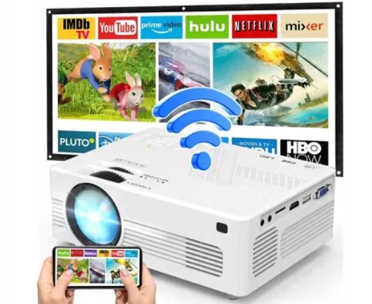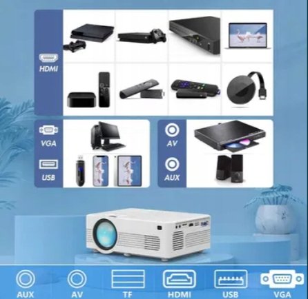 - Szeroka kompatybilność i zastosowanie Ten domowy projektor Wi-Fi jest wyposażony w wiele portów ułatwiających obsługę, w tym HDMI, USB, kartę TF, VGA i interfejs AV. Jest to idealne rozwiązanie do wielu wejść, w tym między innymi do telewizora Stick / Box, konsoli do gier, komputerów, smartfonów i tabletów, laptopów, odtwarzaczy DVD, karty TF i USB, głośniki zewnętrzne itp.