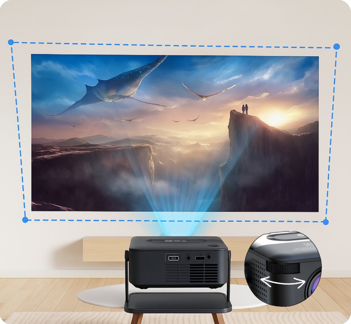 Szybko dopasujesz kąt i ostrość obrazu, dzięki czemu z łatwością uzyskasz idealny prostokątny kadr, nawet przy ustawieniu projektora pod lekkim kątem.