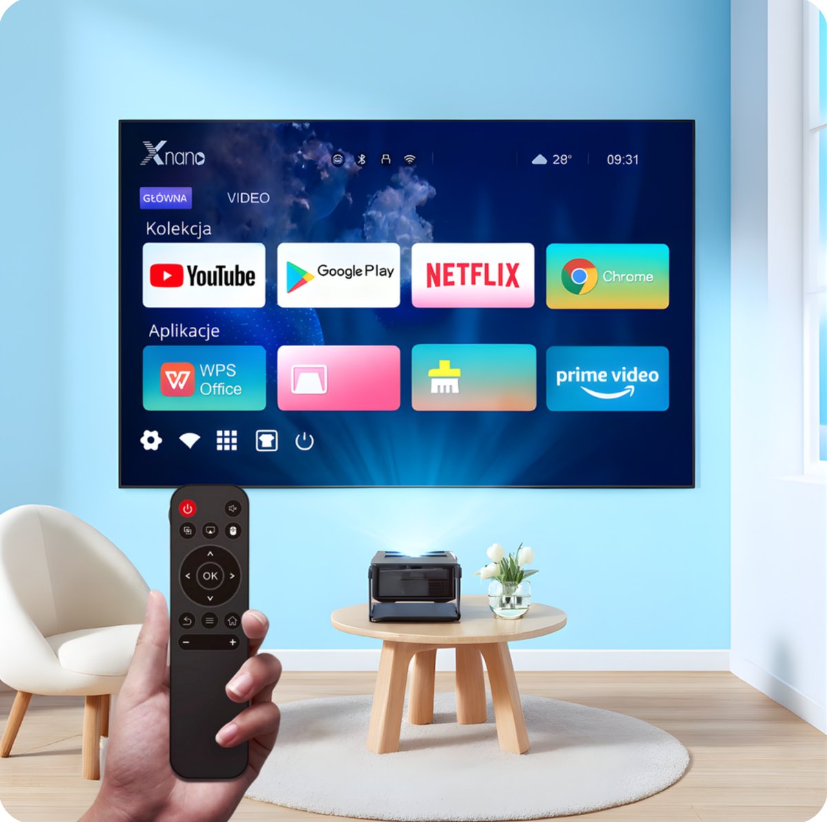 Projektor działa w oparciu o nowoczesny system Android 11, który pozwala instalować aplikacje z Google Play (m.in. YouTube, Netflix, Disney+, Prime Video, Spotify i wiele innych). Dzięki temu możesz korzystać z ulubionych platform bez dodatkowych urządzeń.