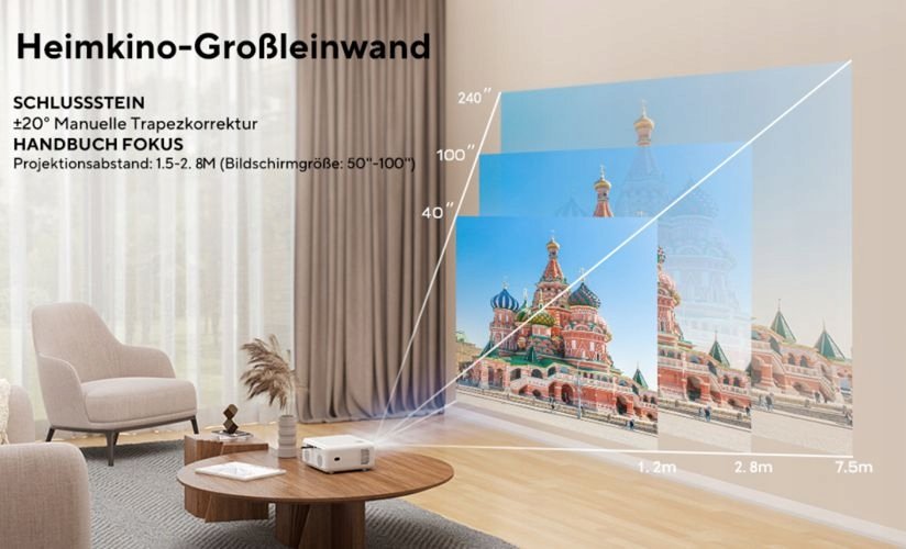 Wspaniałe wrażenia na płótnie: Rozmiary projektora od 40" do 240" z optymalną odległością od projektora od 1,2 do 7,5 m (zalecana odległość i rozmiar ekranu: 1,5-2,8 m i standardowym współczynnikiem projekcji 1,4. Pielęgnacja oczu: Dzięki dużemu ekranowi i rozproszonej technologii odbicia możesz cieszyć się czasem filmowym z mniejszą bezpośrednimi uszkodzeniami oczu. System redukcji szumów redukuje odczuwalny hałas projektora nawet o 50%, zapewniając wciągający wieczór filmowy.
