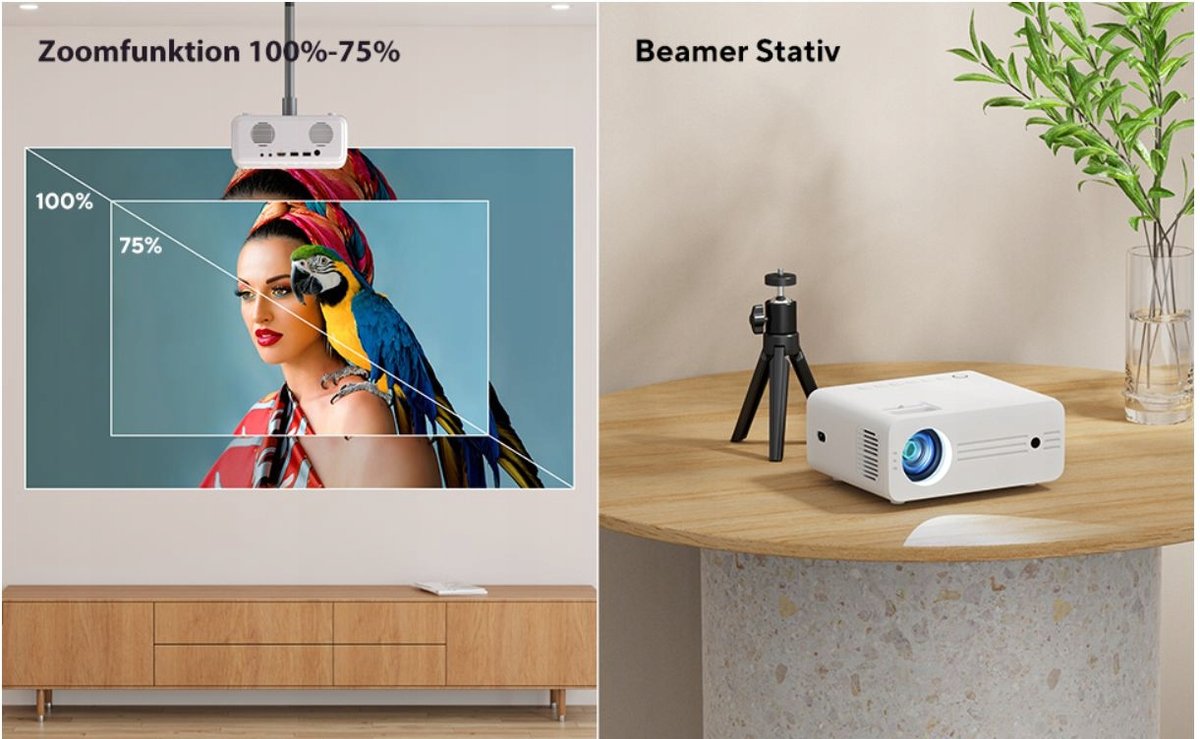 Projektor Bluetooth AKIYO jest wyposażony w funkcję "zoom", która zmniejsza obraz do 75% swojej pierwotnej długości i szerokości. Dzięki tej innowacyjnej funkcji nie jest już konieczne często dostosowywanie odległości projektora do rozmiaru płótna. W zestawie znajduje się również statyw dopasowany na miarę. Może pomóc w wygodniejszym użytkowaniu projektora, co zapewnia duży komfort podczas oglądania filmów w sypialni i na podwórku.