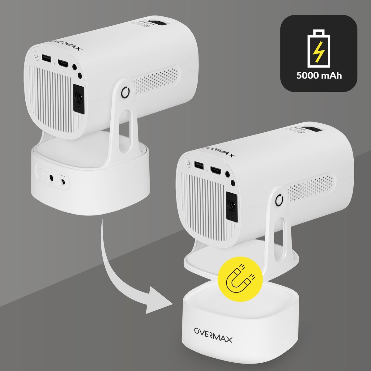 Projektor ma możliwość bezprzewodowego działania, co jest zasługą doczepianej do bazy baterii, która jest montowana za pomocą magnesu, co umożliwia łatwe i szybkie jej podłączanie. Dzięki możliwości bezprzewodowej projekcji przez aż 120 minut zyskujesz swobodę organizowania prezentacji lub plenerowego oglądania filmów na ogrodzie, pod namiotem lub podczas kempingu.