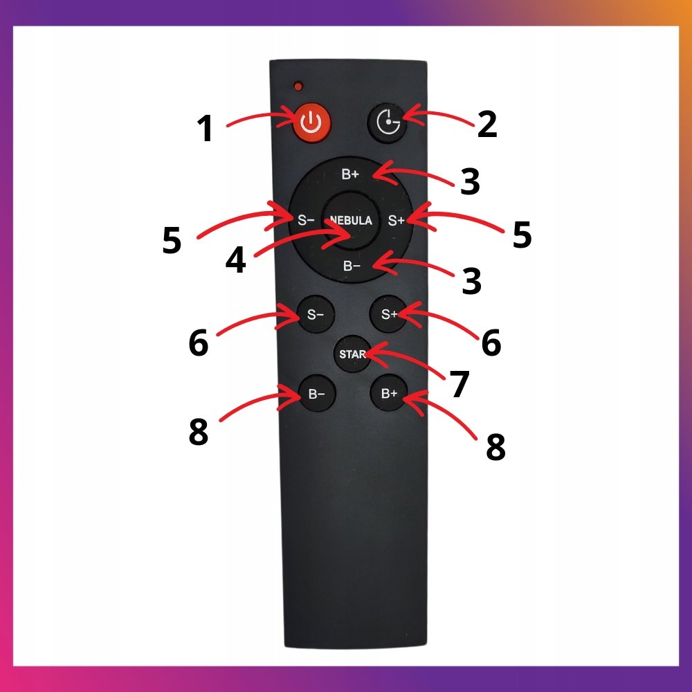 ✨ Pilot w zestawie – Wygodne sterowanie bez konieczności podchodzenia do urządzenia. Za pomocą pilota możesz zmieniać kolory, regulować jasność, ustawiać timer oraz kontrolować ruch mgławicy i gwiazd.