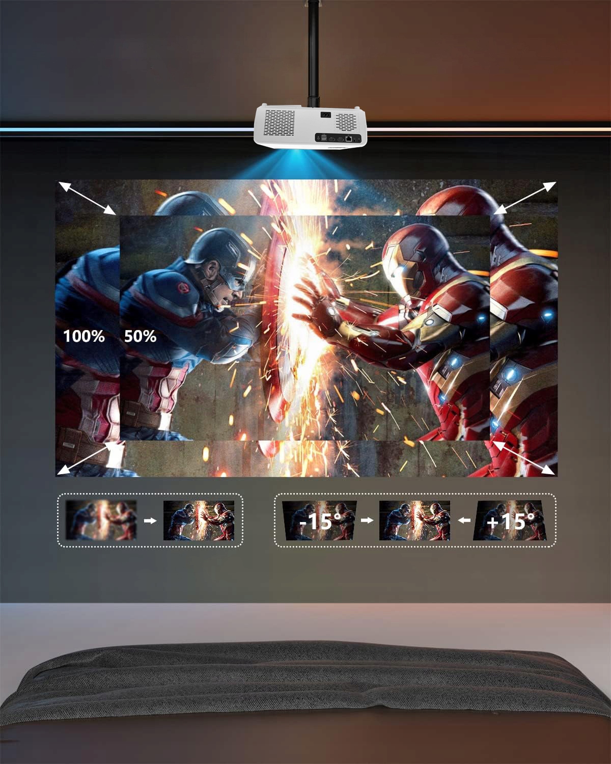 Projektor posiada funkcję wyświetlania obrazu 360, dzięki czemu możesz regulować kąt obrazu i go dowolnie obracać o 90 stopni w każdą stronę. W ten sposób możesz na przykład zamontować projektor do góry nogami do sufitu i wyświetlać obraz w wygodny dla Ciebie sposób obracając obraz na przykład o 180 stopni.