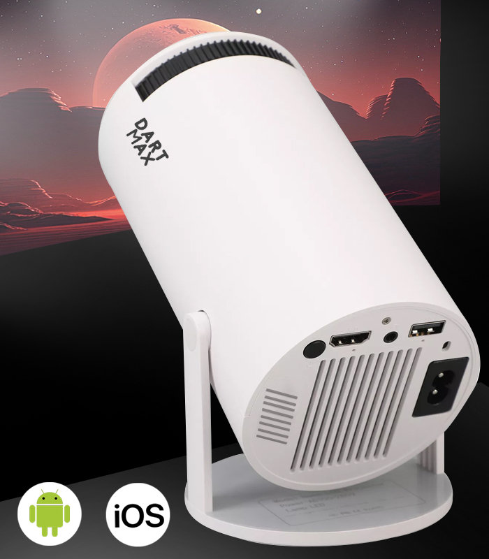 Wyjątkową zaletą projektora jest pełna kompatybilność z systemami operacyjnymi iOS oraz Android, co otwiera przed użytkownikami ogromne możliwości. Dzięki temu, w prosty i szybki sposób zyskasz dostęp do popularnych aplikacji, takich jak Netflix, Disney+, YouTube czy Google. Umożliwia to strumieniowe oglądanie filmów, seriali oraz słuchanie muzyki. Projektor wyposażony jest w post USB i HDMI. Wbudowany głośnik dodatkowo urozmaica doświadczenia audio-wizualne. Nasz projektor ma regulowany kąt projekcji wynoszący aż 180°. Dzięki temu masz pełną kontrolę nad wyświetlanym obrazem i możesz dostosować jego położenie do swoich indywidualnych potrzeb.